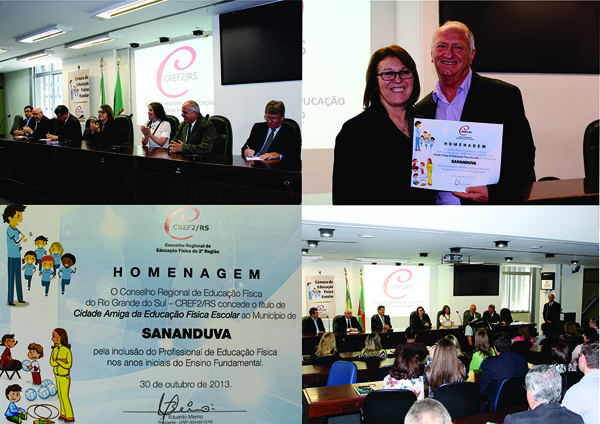 Sananduva foi homenageada na tarde de quarta-feira (30), no Plenarinho da Assembleia Legislativa do Estado. O evento promovida pelo Conselho Regional de Educação Física - CREF2/RS foi uma forma de reconhecimento aos municípios que contam com profissionais de educação física atuando nas séries iniciais do Ensino Fundamental.