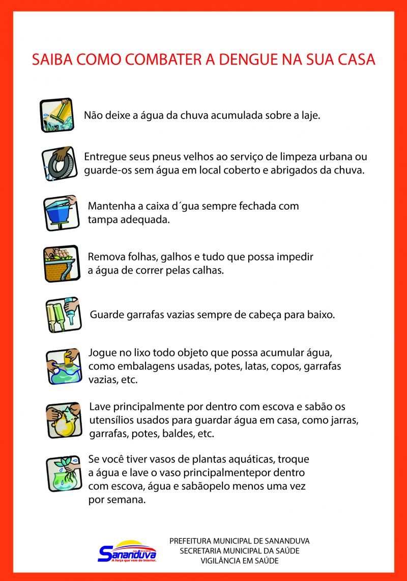 Para isso é importante não deixar acumular água em latas, carros abandonados, embalagens, copos plásticos, tampinhas de garrafas, pneus velhos, vasos de flores, jarros, garrafas, caixas d’água, tambores, latões, cisternas, sacos plásticos, lixeiras entre outros. Nas residências e terrenos baldios cada um deve fazer a sua parte evitando o acúmulo de lixo nos quintas e locais que podem se transformar em criadouros do mosquito.