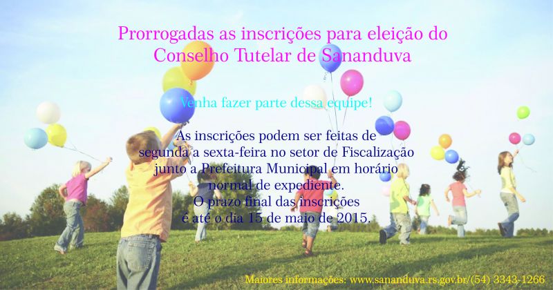 O Conselho Municipal dos Direitos da Criança e do Adolescente de Sananduva prorrogou as inscrições do processo de escolha de Conselheiro Tutelar até o dia 15/05 (sexta-feira).