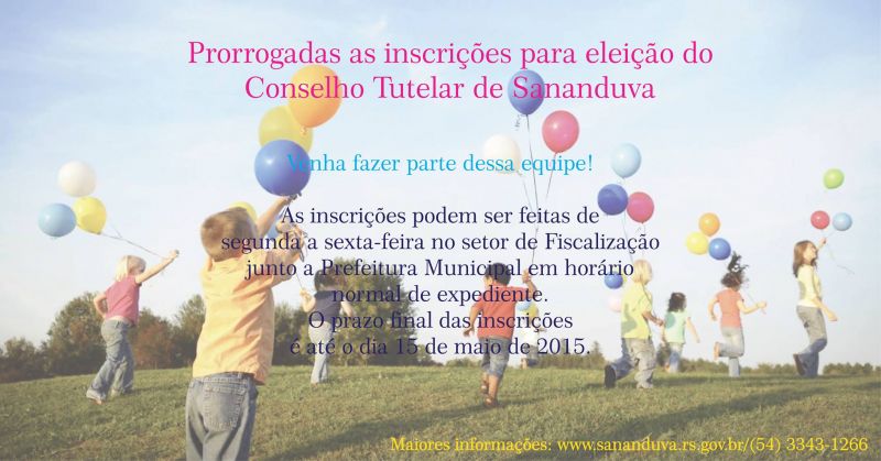 Encerra hoje às 17hs, o período de inscrições para o Conselho Tutelar. Podem participar do processo seletivo pessoas com mais de 21 anos, que moram a dois anos ou mais no Município e que comprovem um ano de trabalho na defesa dos direitos da criança e do adolescente.