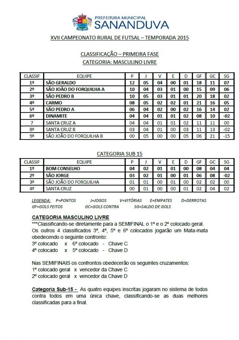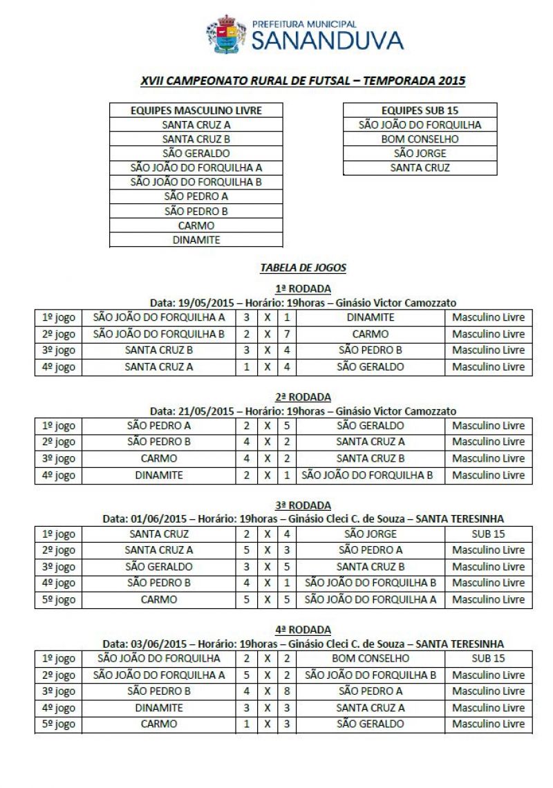 Esta em andamento o XVII Campeonato Rural de Futsal, promoção da Administração Municipal de Sananduva e Fair Play Produções Esportivas. A competição que teve início dia 19/05 tem 9 equipes na categoria Masculino Livre e 5 equipes na categoria SUB 15.
