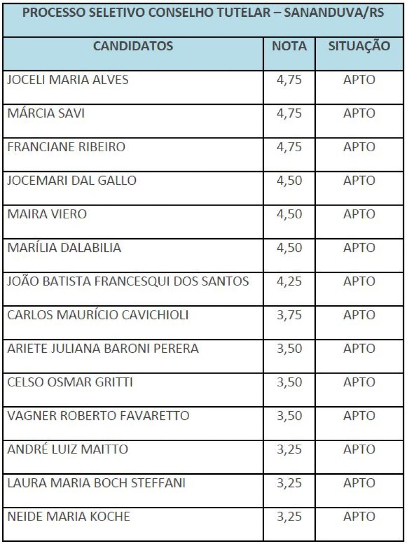 Foi publicada a lista da classificação preliminar da prova objetiva realizada no dia 26 de julho de 2015, referente ao processo de escolha dos conselheiros tutelares do município de Sananduva, Edital 001/2015, de acordo com o anexo enviado pela empresa Sigma Assessoria e Consultoria, responsável pela aplicação da prova.