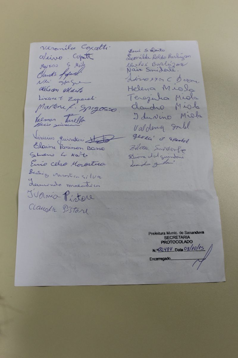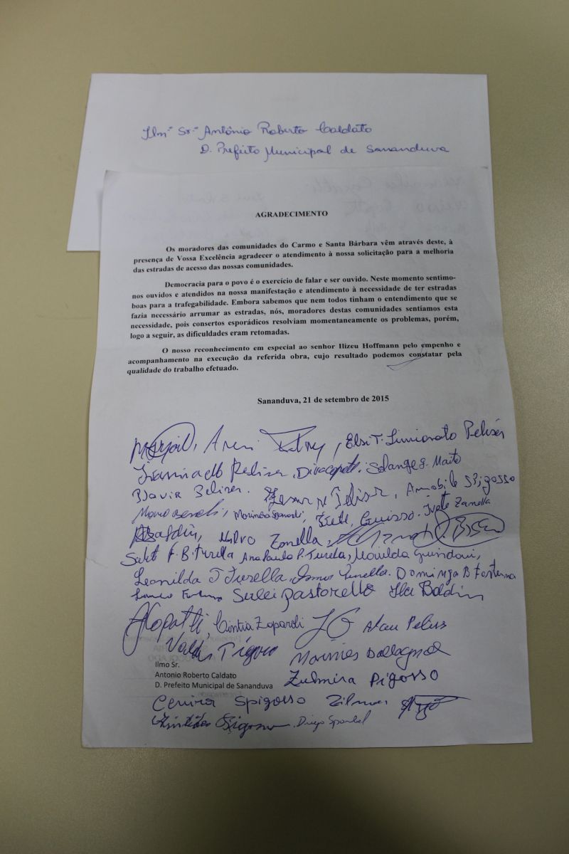 O teor do documento é o seguinte: “Os moradores das Comunidades do Carmo e Santa Bárbara vêm através deste, á presença de Vossa Excelência agradecer o atendimento a nossa solicitação para a melhoria das estradas de acesso das nossas comunidades. Democracia para o povo é exercício de falar e ser ouvido. Neste momento sentimo-nos ouvidos e atendidos na nossa manifestação e atendimento a necessidade de ter estradas boas para a trafegabilidade. Embora, sabemos nem todos tinham o entendimento que se fazia necessário, arrumar as estradas, nós moradores destas comunidades sentíamos esta necessidade, pois consertos esporádicos resolviam momentaneamente os problemas, porém, logo a seguir, as dificuldades eram retomadas. O nosso reconhecimento em especial ao senhor Elizeu Hoffmann pelo empenho e acompanhamento na execução da referida obra, cujo resultado podemos constatar pela qualidade do trabalho efetuado. Sananduva, 21 de setembro de 2015”.