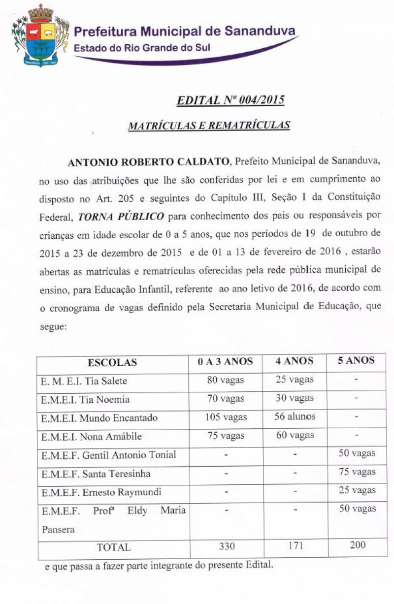 No período de 19 de outubro a 23 de dezembro de 2015 e de 01 a 13 de fevereiro de 2016, estarão abertas as matrículas e rematrículas para a educação infantil e ensino fundamental referente ao ano letivo de 2016, de acordo com o cronograma de vagas definidos pela Secretaria Municipal de Educação e Cultura.