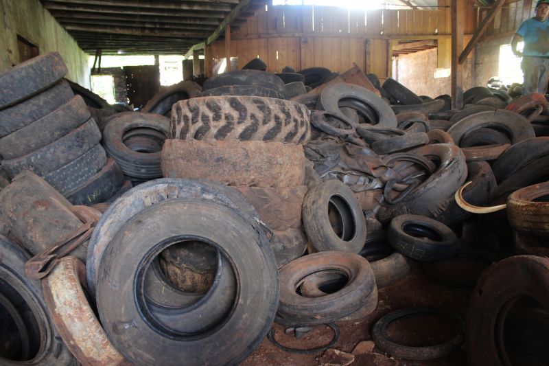 Quando os pneus velhos são descartados irregularmente poluem o meio ambiente e ameaçam a saúde pública, pois servem de criadouros para mosquitos transmissores da dengue.