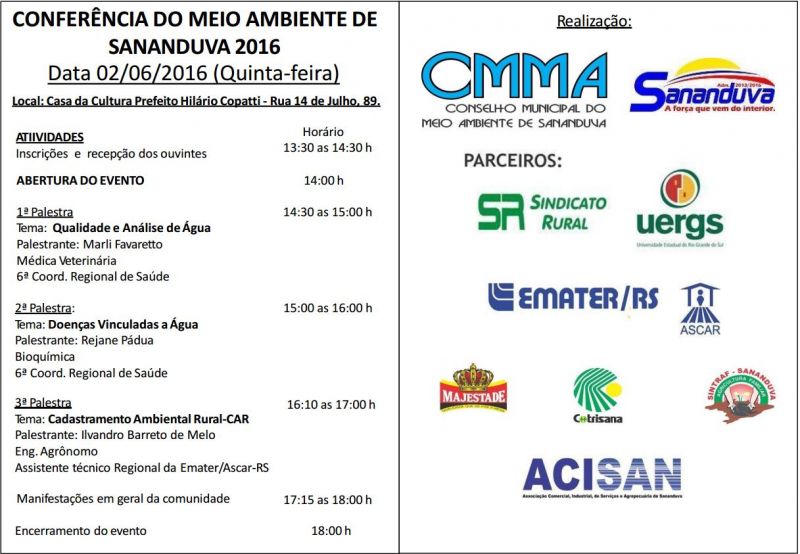 O poder Público Municipal de Sananduva juntamente com a Secretaria de Agricultura e Meio Ambiente e com o Conselho Municipal do Meio Ambiente, convidam a comunidade em geral e responsáveis pelos poços artesianos para participar da Conferência do Meio Ambiente de Sananduva, a ser realizada no dia 02 de junho de 2016, na Casa de Cultura Prefeito Hilário Copatti com início as 13h30min conforme programação.