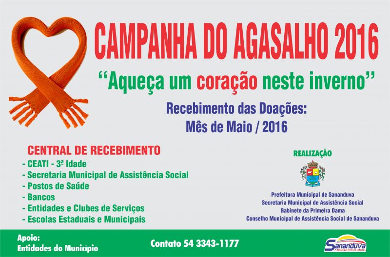 O Município de Sananduva através da Secretaria Municipal de Assistência Social, Conselho Municipal de Assistência Social e Gabinete da Primeira-Dama, comunicam que a Campanha do Agasalho 2016 com o tema “Aqueça um coração neste inverno”, continua.