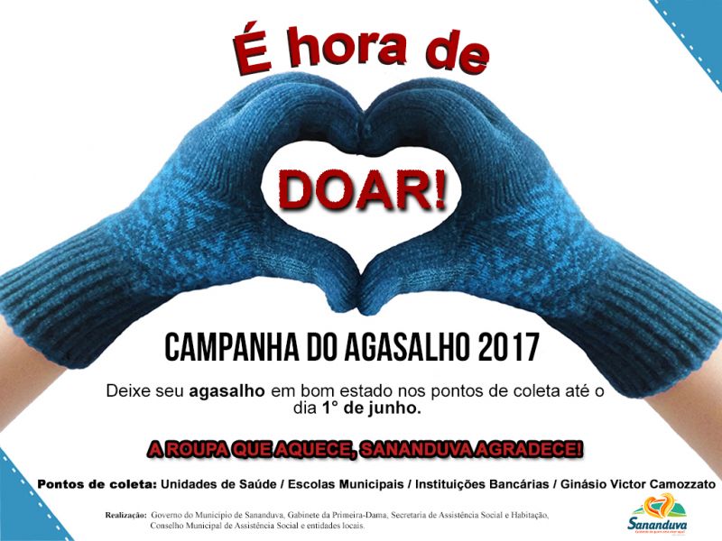 A Campanha do Agasalho é realização do Governo do Município de Sananduva, através do Gabinete da Primeira-Dama e Secretaria de Assistência Social e Habitação, Conselho Municipal de Assistência Social e entidades locais. A roupa que aquece, Sananduva agradece!