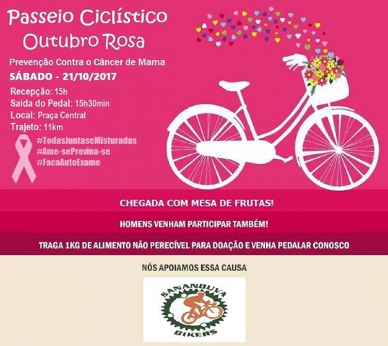 O Sananduva Bikers promove o 1º Passeio Ciclístico Outubro Rosa para lembrar da importância da prevenção e do tratamento do câncer de mama. O exercício físico também é uma forma de prevenção, então vamos pedalar?