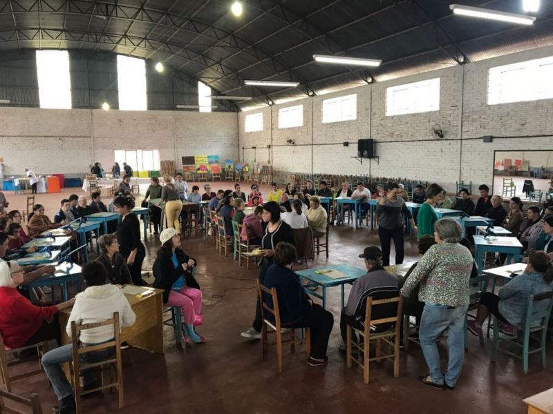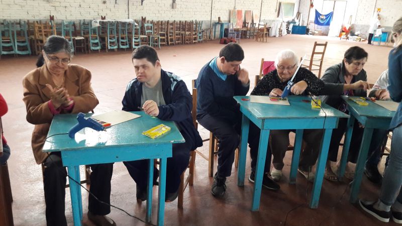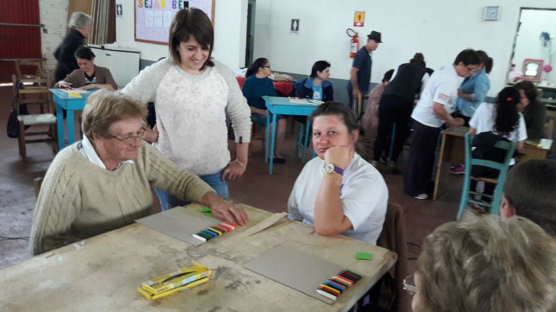 No primeiro momento foi realizado um trabalho de ajuda mútua, onde os participantes realizaram em duplas uma atividade artesanal em telas, utilizando a técnica de giz de cera derretido. Esta integração entre os grupos proporcionou uma troca de experiências e de vivência da diversidade presente no contexto social.
