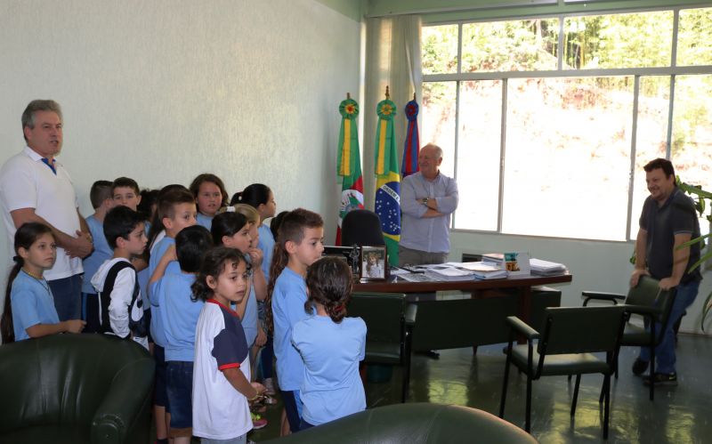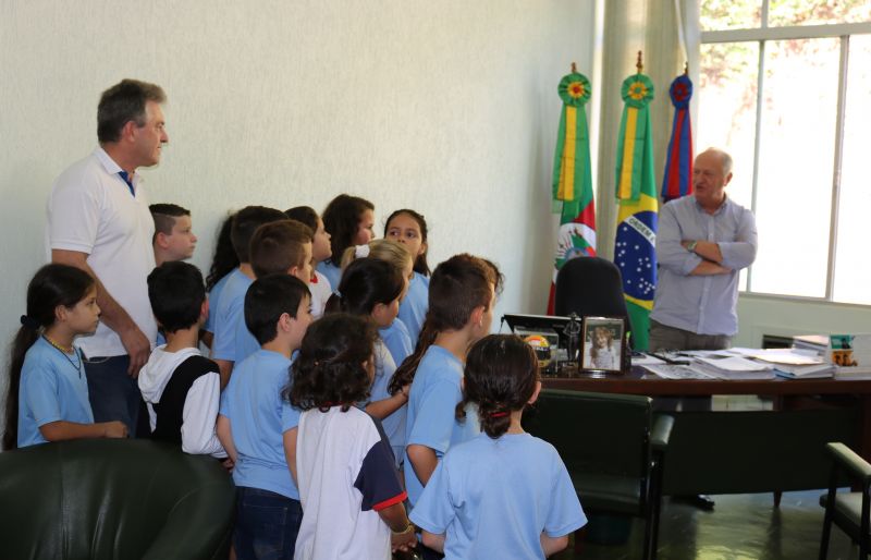 Acompanhados pelo diretor Sadi Dalsóglio, professores e familiares, eles visitaram secretarias municipais e alguns setores. Também foram recebidas pelo prefeito Leomar José Foscarini em seu gabinete. O prefeito parabenizou o projeto e agradeceu a visita. “Fico muito feliz com essa iniciativa, todos são bem-vindos ao gabinete. Venham sempre que desejarem”, salientou o prefeito. Os alunos aproveitaram para convidar o chefe do Executivo para visitar a Escola novamente.
