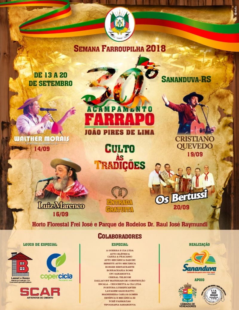 A Semana Farroupilha 2018 e 30° Acampamento Farrapo João Pires de Lima conta com a colaboração de empresas parceiras: Copercicla, Lazzari e Basso Materiais de Construção, Scar Artefatos de Cimento, A Guerra e Cia Ltda – CMV, Auto Elétrica Carra & Fracasso, Auto Mecânica Baroni, Benetti Auto Mecânica, Borges Restaurante, Borracharia Rossi, CFC Sananduva, Creral Telecom, Dallacort Materiais de Construção, Escala – Chiochetta e Cia Ltda, Fortuna Lubrificantes, Lavagem Sagioratto, Madeireira Carlos Gomes, Retífica e Mecânica ZZ, Tchê Farmácias e Tipografia Sananduva.
