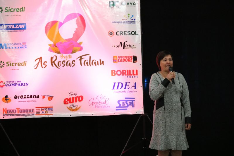A finalidade do Projeto As Rosas Falam, idealizado pela prefeita de Santa Cecília do Sul, Jusene Peruzzo, é promover a integração das mulheres na vida pública através de ações sociais nos municípios. A primeira-dama de Sananduva, Maria Lucia Tonial Foscarini, e a vice-primeira-dama Suzana Benedetti, estiveram presentes prestigiando o evento, acompanhadas pelo prefeito Leomar José Foscarini e o vice Loevir Benedetti. Durante pronunciamento, Maria Lucia deu as boas-vindas aos visitantes e falou da importância do Projeto. “Esta iniciativa está promovendo a integração e a união dos municípios da Amunor, e nós precisamos nos fortalecer para crescermos juntos”, concluiu ela agradecendo a presença de todos.