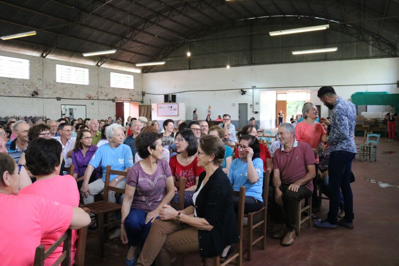 A palestra show conduzida por Deivid Freitas trouxe momentos de descontração, reflexão e informação. Centenas de idosos prestigiaram o evento que contou com a presença do prefeito Leomar José Foscarini, primeira-dama Maria Lucia Tonial Foscarini, presidente da Câmara de Vereadores Odair Cirino Rodrigues, secretário de Assistência Social e Habitação Leonardo Ritti, coordenadora do CRA, Lucivane Dametto, secretária de Educação, Cultura e Desportos, Izabel Cristina Barbizan Vastrinche, secretário de Agricultura, Meio Ambiente e Desenvolvimento Econômico, Adelar Zanin, e a vereadora Eliani Mezadri.