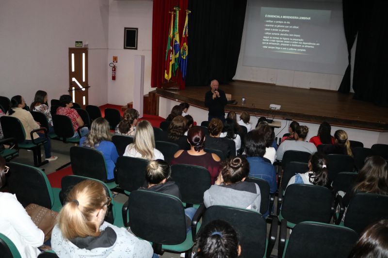 Foram cerca de 50 participantes, entre diretores, merendeiras e funcionários que atuam nos serviços gerais. O trabalho de capacitação foi conduzido pela nutricionista responsável técnica pela alimentação escolar do Município, Luciana Curzel. A secretária de Educação, Cultura e Desportos, Izabel Cristina Barbizan Vastrinche, participou do encontro que contou também com a presença do prefeito Leomar José Foscarini. “Queremos que vocês se comprometam em prestar um bom serviço, que estejam dispostos a melhorar e aprender a cada dia”, solicitou.