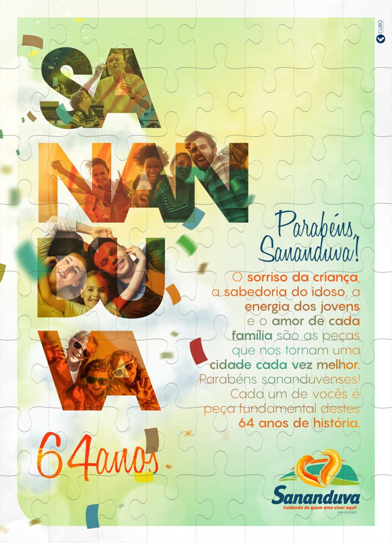 Para comemorar os 64 anos de Sananduva, criamos um anúncio especial em forma de um grande quebra-cabeça. Isso mesmo, um quebra-cabeça com exatas 64 peças, uma homenagem ao aniversário do Município e também àqueles que com esforços diários constroem um município cada vez melhor: os sananduvenses. Vocês são merecedores da nossa gratidão!