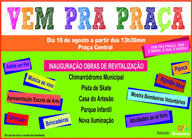 Vai ter a inauguração das obras de revitalização, como chimarródromo, pista de skate, a casa do artesão, parque infantil, nova iluminação e wifi gratuito. Além disso, brincadeiras, pipoca, música ao vivo e muito mais. Convide sua família e venha pra Praça se divertir e aproveitar esse espaço novinho. É dia 18 de agosto a partir das 13h30min. Vem pra Praça, vem! É minha, é sua, é nossa!