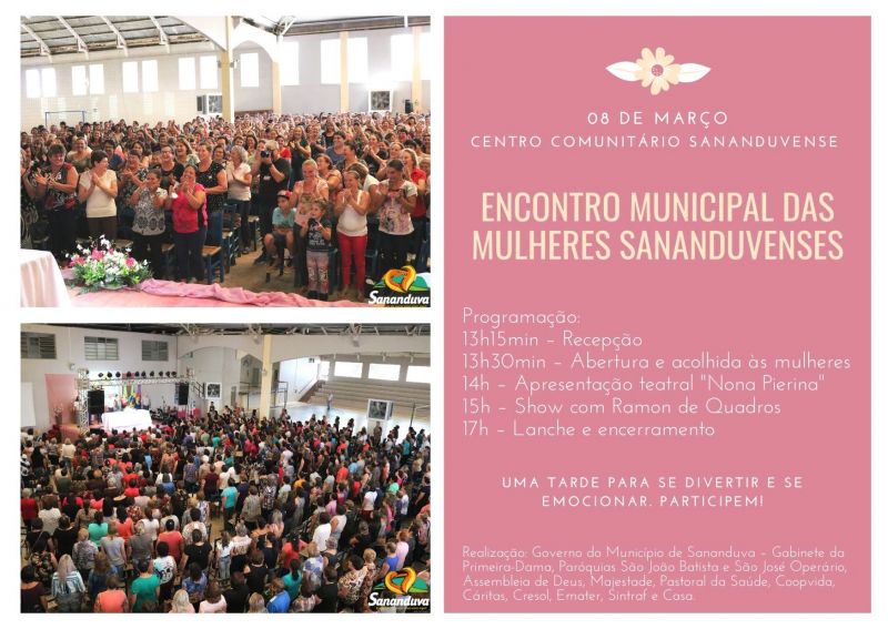Para marcar o Dia Internacional da Mulher, vem aí mais um Encontro Municipal das Mulheres Sananduvenses. É no domingo, dia 08 de março, no Centro Comunitário a partir das 13h.