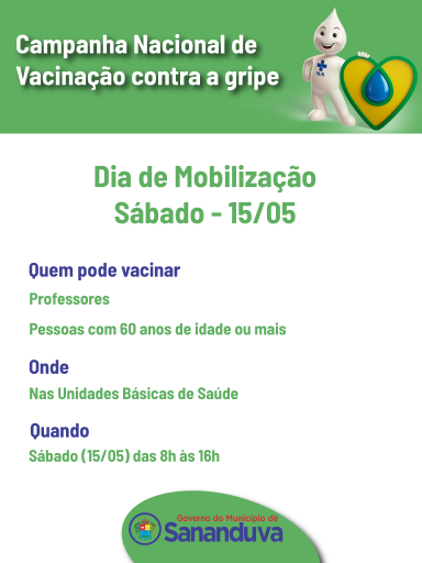 A Campanha Nacional de Vacinação contra a gripe vai ter um Dia de Mobilização. É sábado (15), das 8h às 16h nas Unidades de Saúde.