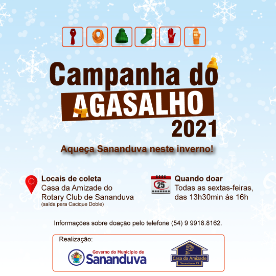A partir de sexta-feira (28) inicia a Campanha do Agasalho 2021 – Aqueça Sananduva neste inverno. Através da iniciativa do Governo Municipal, através da Secretaria da Assistência Social e Habitação, este ano foi realizada uma parceria com a Casa da Amizade, do Rotary Club de Sananduva.