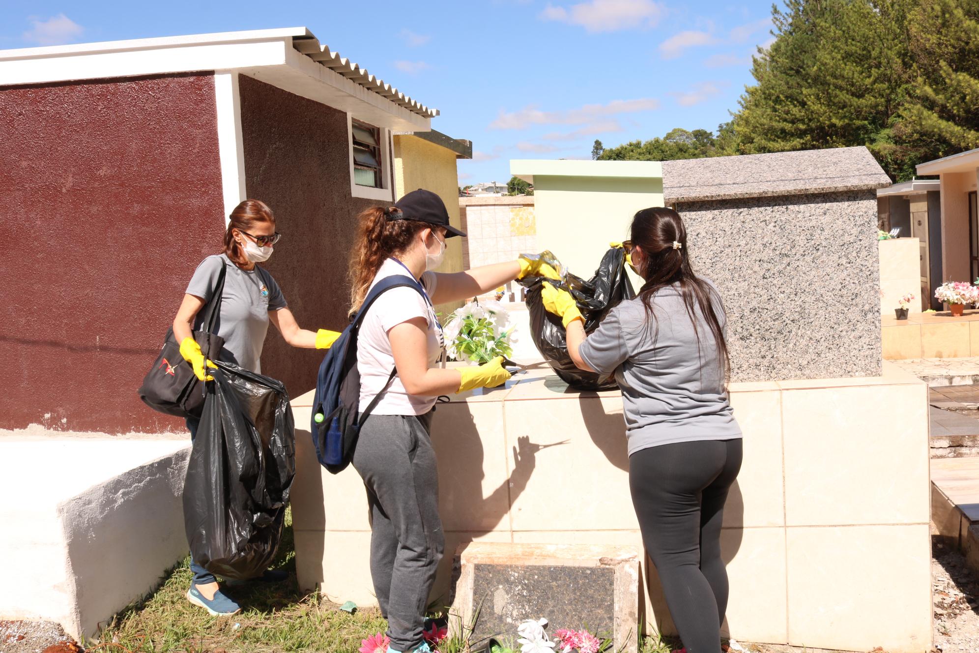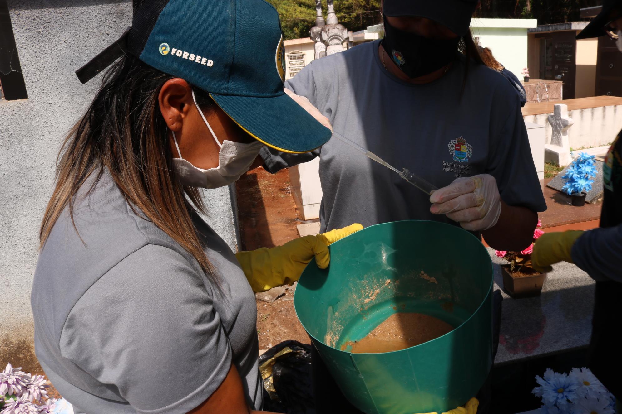 Na manhã desta sexta-feira (03), Agentes de Combate a Endemias e Agentes Comunitários de Saúde da Unidade Básica da Vila Jardim estiveram realizando vistoria no Cemitério Municipal João Paulo II. A ação programada pelas Agentes objetiva identificar e eliminar possíveis criadouros do mosquito Aedes aegypti, tendo em vista a movimentação de pessoas que aconteceu nos finados e as chuvas dos últimos dias. Durante o trabalho, as servidoras removeram os plásticos dos vasos de flores, eliminaram locais com água parada e coletaram amostras das larvas encontradas.