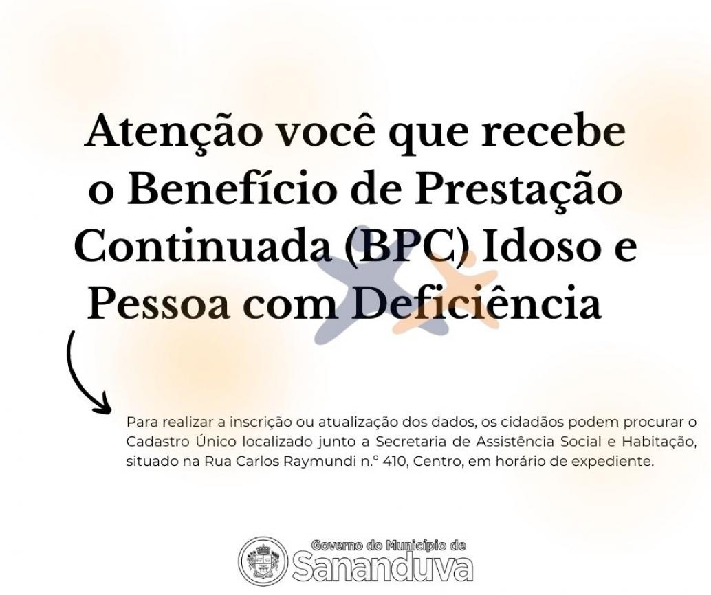 A Secretaria de Assistência Social e Habitação informa a necessidade da inclusão de beneficiários do Benefício de Prestação Continuada (BPC) Idoso e Pessoa com Deficiência no Cadastro Único do Governo Federal para Programas Sociais, sob pena de bloqueio do pagamento do benefício.