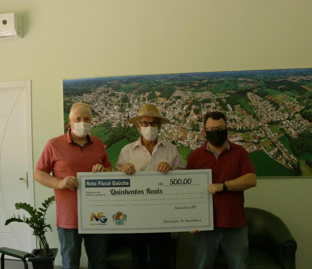 No início da tarde desta quarta-feira (09) foi realizada mais uma entrega de premiação do Programa Nota Fiscal Gaúcha, a primeira do ano de 2022. A entrega aconteceu na Prefeitura Municipal de Sananduva, com a presença do prefeito Vermelho Pansera, do secretário do Planejamento e Desenvolvimento Econômico Rodrigo Getelina e do contemplado, Ernesto Camera.