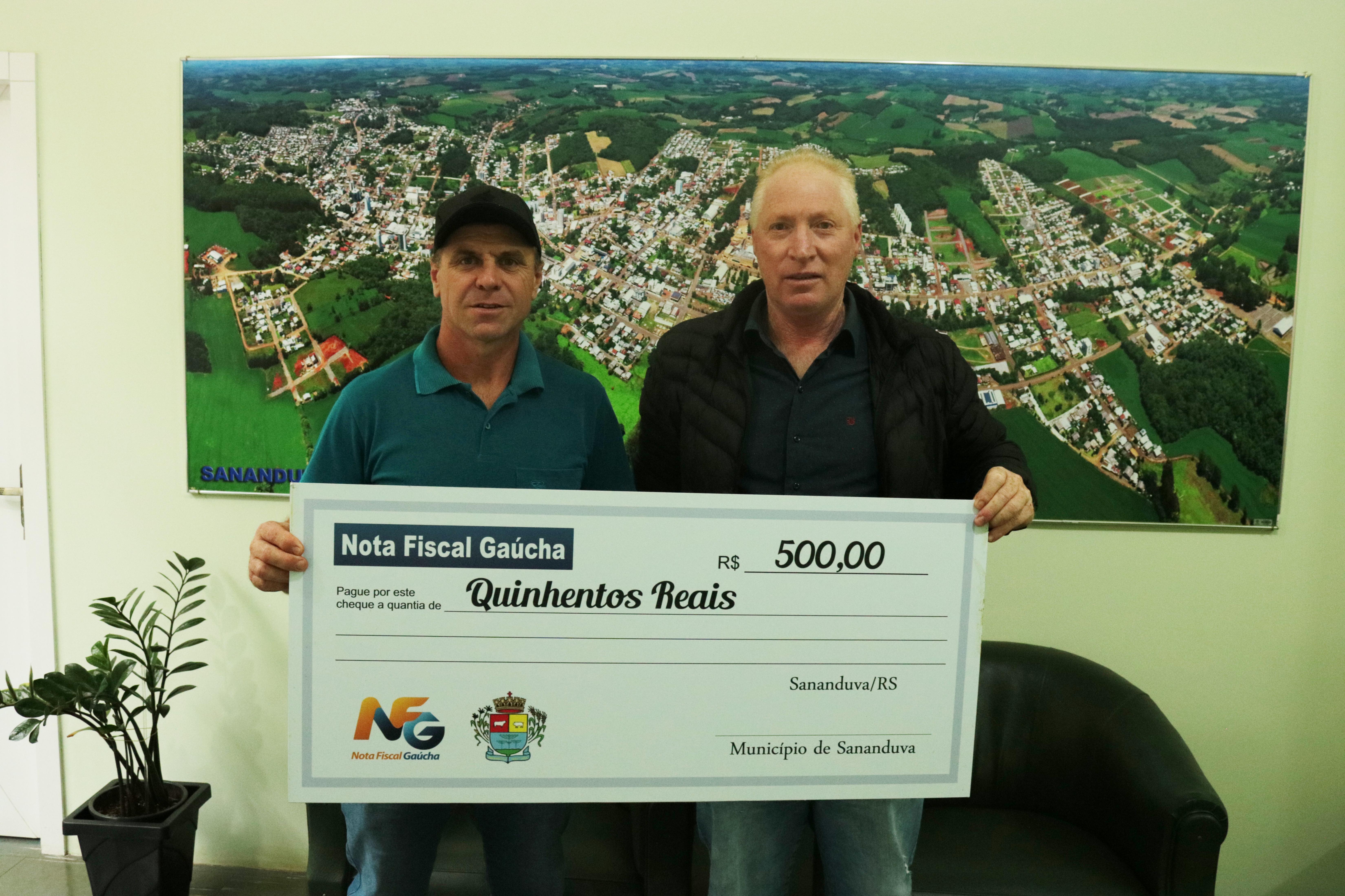 Na tarde de quinta-feira (07) foi realizada mais uma entrega de premiação do Programa Nota Fiscal Gaúcha. A entrega aconteceu na Prefeitura Municipal de Sananduva, com a presença do prefeito Vermelho Pansera e do contemplado da vez, Juliano Baldin.