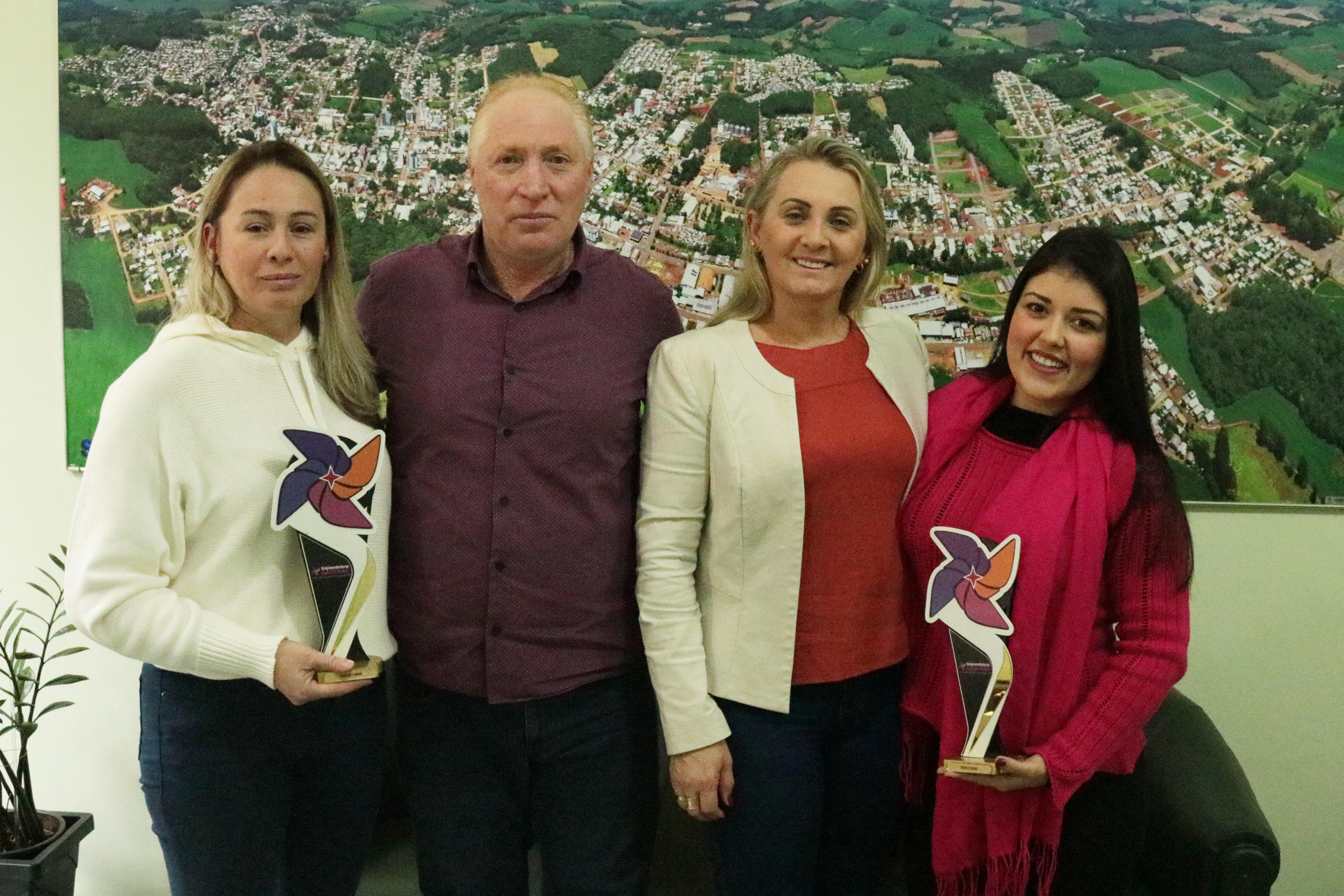 Na tarde de segunda-feira (02), o prefeito Vermelho Pansera e a primeira-dama Luci Pansera receberam as visitas de Francieli Fabian, micropigmentadora e tatuadora, e Fabiola Soares, nutricionista, que foram condecoradas com o prêmio Empreendedoras Gaúchas 2022, representando o município de Sananduva. A entrega do prêmio foi realizada no dia 03 de abril de 2022 em Porto Alegre, e homenageou mais de 200 mulheres empreendedoras do RS.