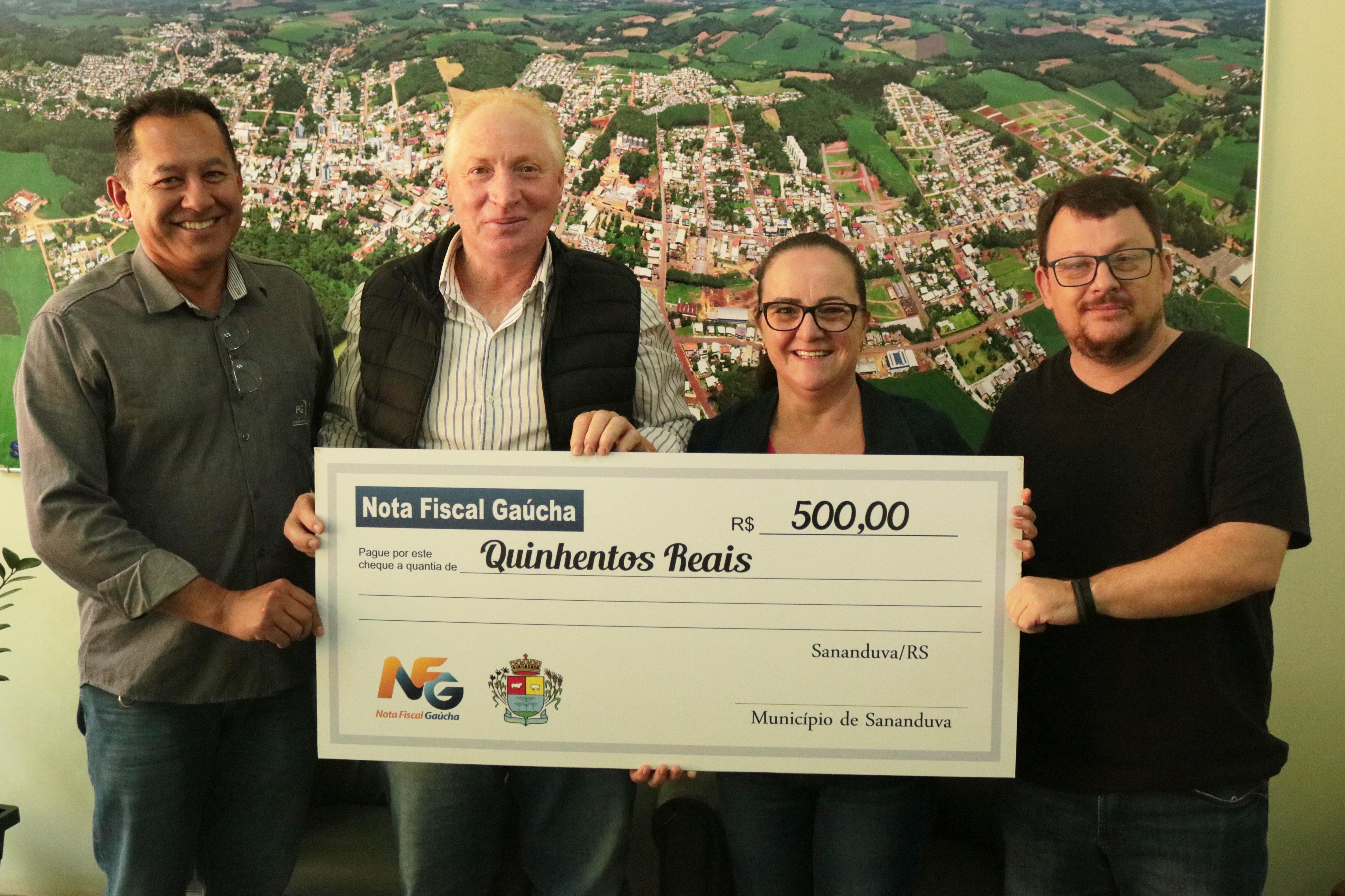 Na tarde de segunda-feira (09) foi realizada mais uma entrega de premiação do Programa Nota Fiscal Gaúcha. A entrega aconteceu na Prefeitura Municipal de Sananduva, com a presença do prefeito Vermelho Pansera, do secretário do Planejamento e Desenvolvimento Econômico de Sananduva, Rodrigo Getelina e da contemplada da vez, Maria Luísa de Mello Pascoal, residente de Santo Expedito do Sul.