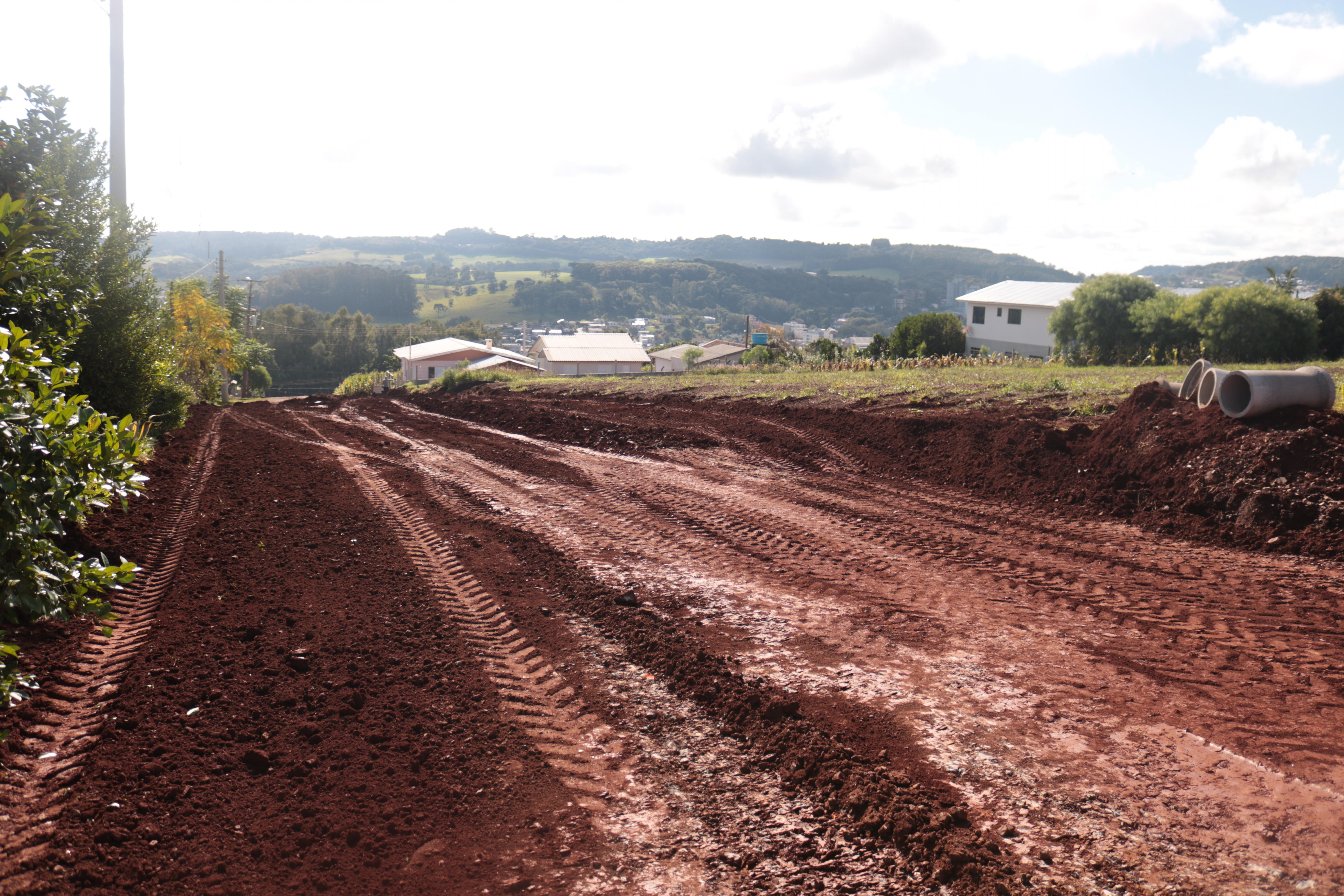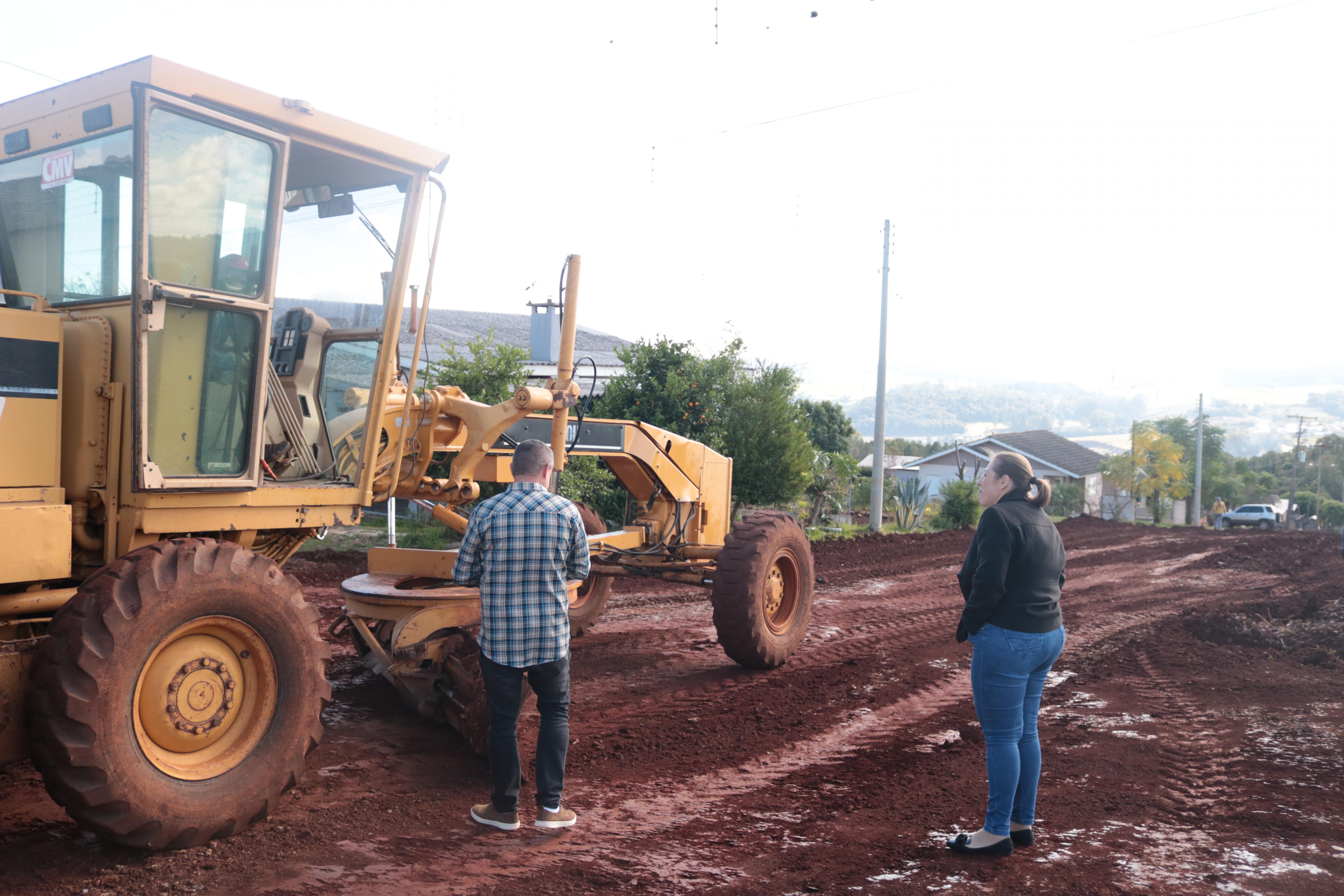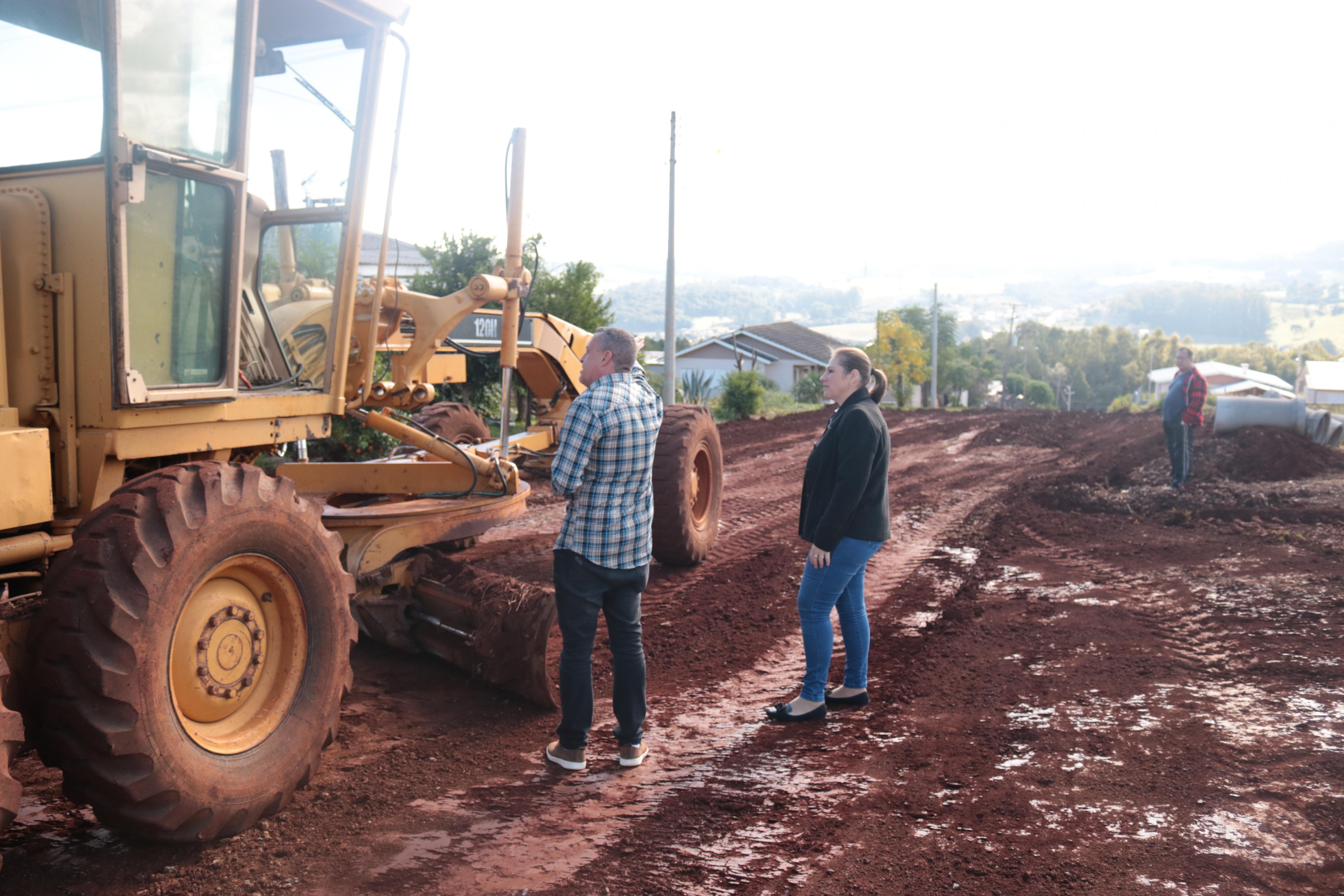 Na manhã de quinta-feira (12), a prefeita em exercício Caroline Brezolin e o diretor de projetos Carlos José Picolotto acompanharam o início das obras para receber a pavimentação asfáltica em diversas ruas do bairro Vila Nova. Caroline Brezolin esteve na Rua Clovis Luiz Savi, na divisa entre o loteamento Perin e a Vila Nova.