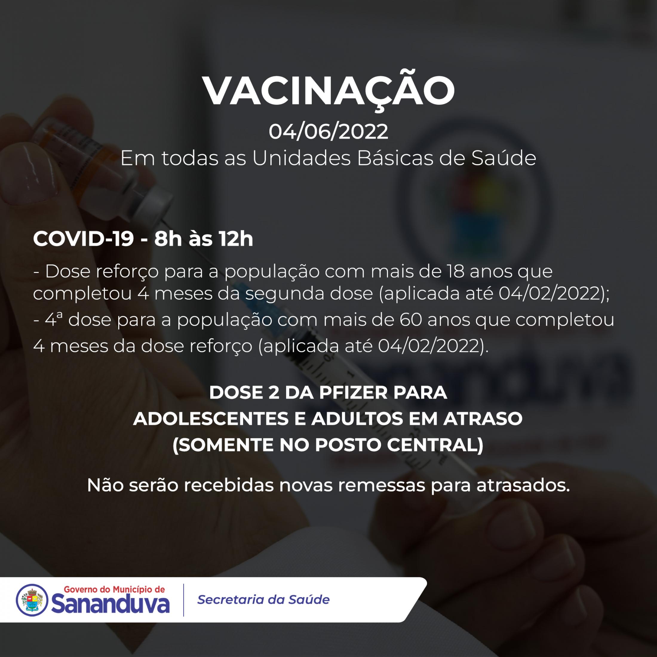 - Segunda dose da Pfizer para adolescentes e adultos em atraso (somente no Posto Central).