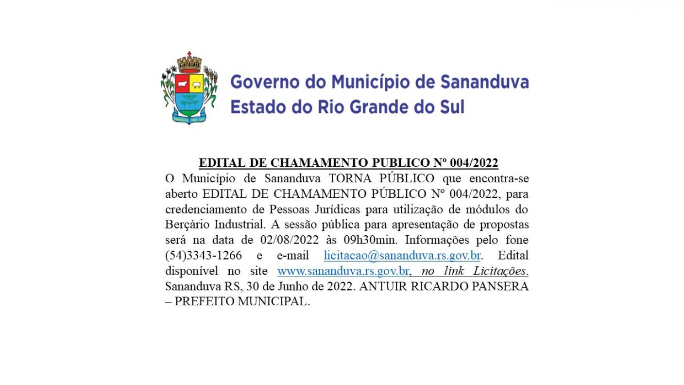Confira o extrato do Edital de Chamamento Público nº 004/2022, que visa o credenciamento de Pessoas Jurídicas para utilização de módulos do Berçário Industrial.