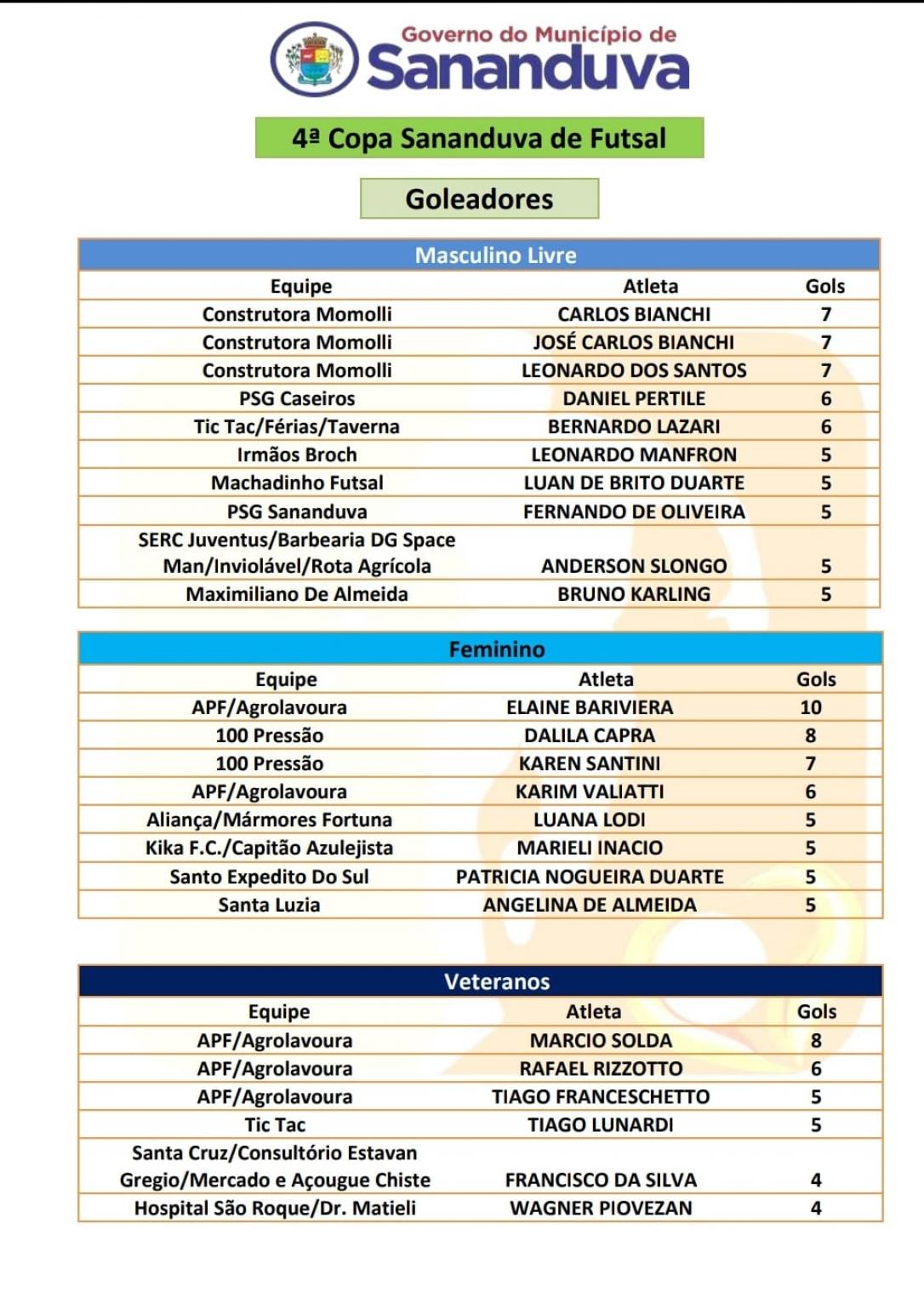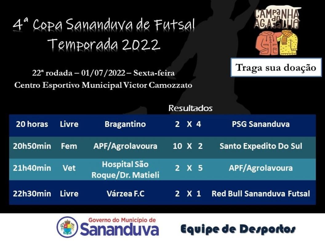Na última semana findou mais uma rodada de jogos da 4ª Copa Sananduva de Futsal. Os jogos acontecem sempre nas terças e quintas com início às 19h30min, e nas sextas com início às 20h, no Centro Esportivo Municipal Victor Camozzato. A entrada ao ginásio para acompanhar aos jogos é gratuita.