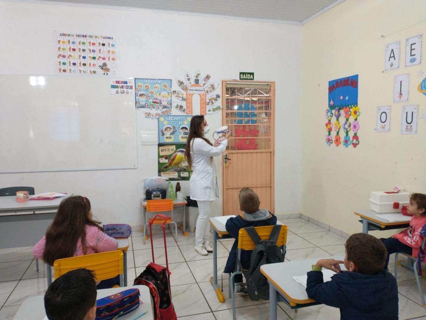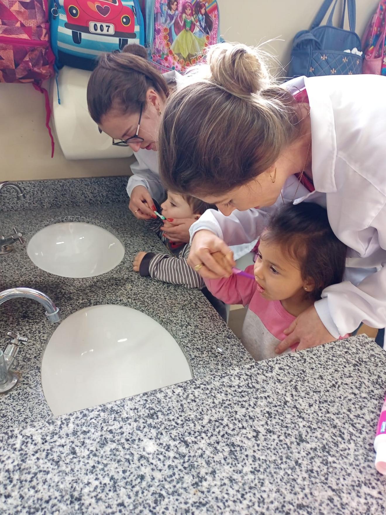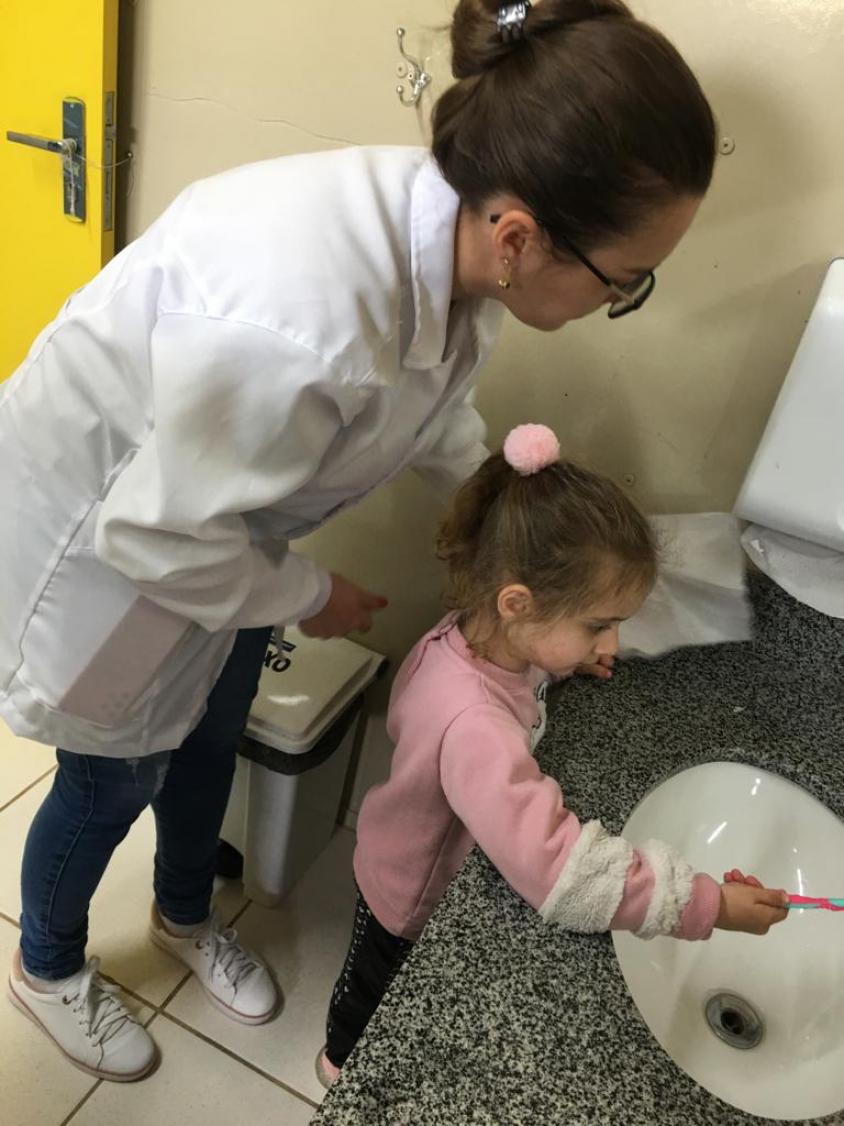 Da UBS São José Operário, a dentista Caroline Cirino Rodrigues e auxiliar em saúde bucal Doriane Savi palestraram para os alunos da E.M.E.F. Prof.ª Eldy Maria Pansera sobre a importância da higiene bucal, e em seguida foi realizada a escovação supervisionada com os alunos do pré-escolar ao 9º ano. As profissionais também estiveram na E.M.E.I. Mundo Encantado.