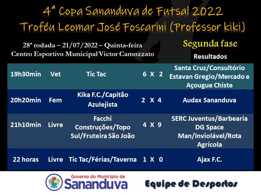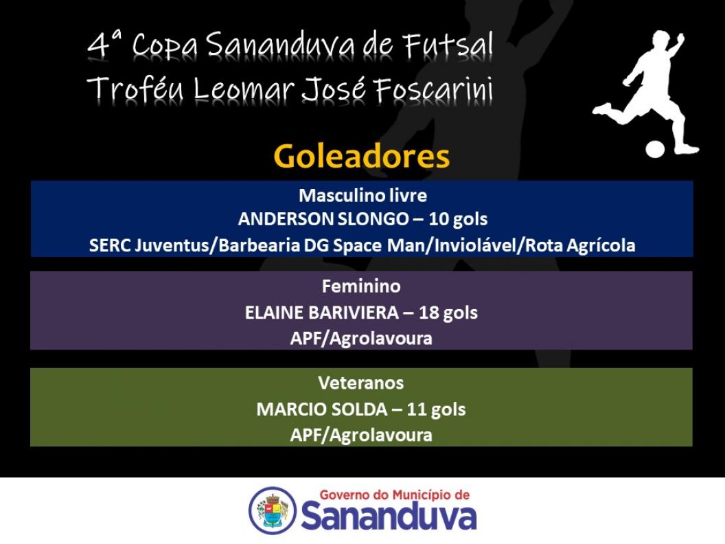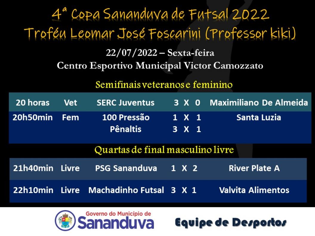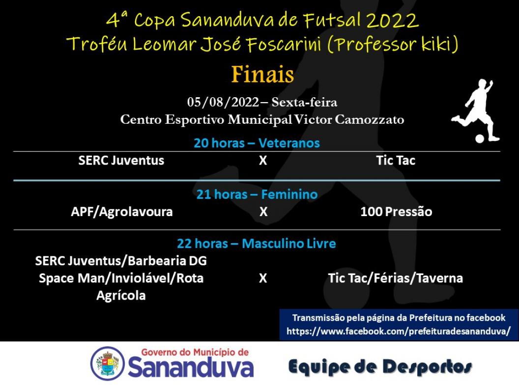 Na última semana aconteceram os jogos que definiram as finais da 4ª Copa Sananduva de Futsal. As categorias masculino livre, feminino e veteranos entram em quadra na próxima sexta-feira na briga pelo título.