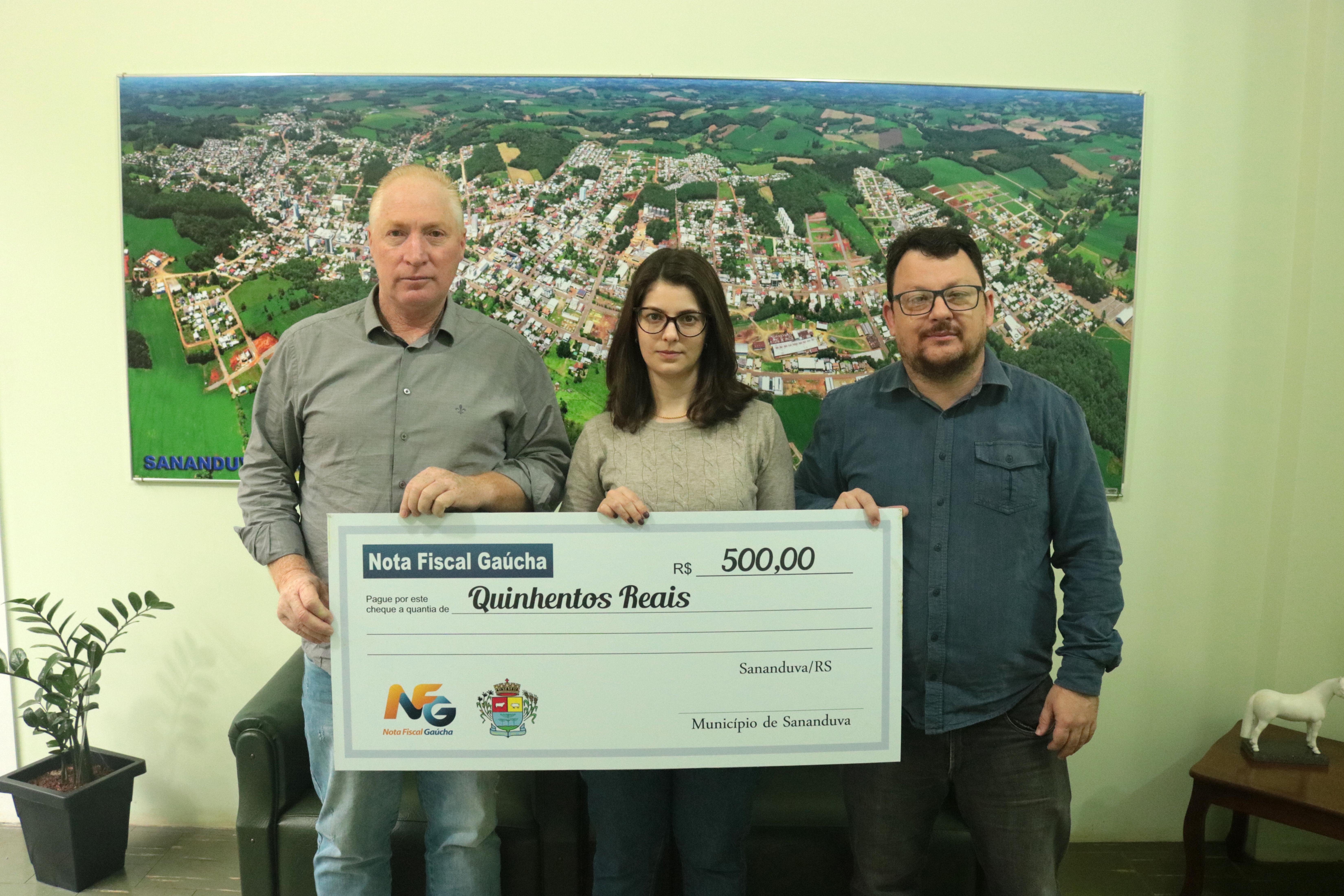 Na manhã desta quinta-feira (04) foi realizada mais uma entrega de premiação do Programa Nota Fiscal Gaúcha. A entrega aconteceu na Prefeitura Municipal de Sananduva, com a presença do prefeito Vermelho Pansera, do secretário do Planejamento e Desenvolvimento Econômico, Rodrigo Getelina e da contemplada da vez, Aline Correa Moreira.