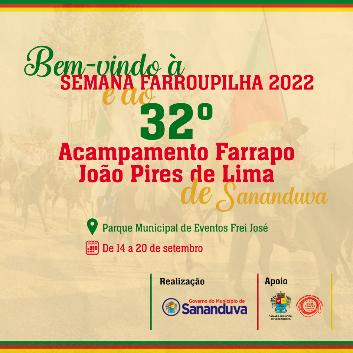 A Semana Farroupilha 2022 e 32º Acampamento Farrapo João Pires de Lima é realização do Governo do Município de Sananduva com apoio da Câmara Municipal de Vereadores e CTG Doze Braças.