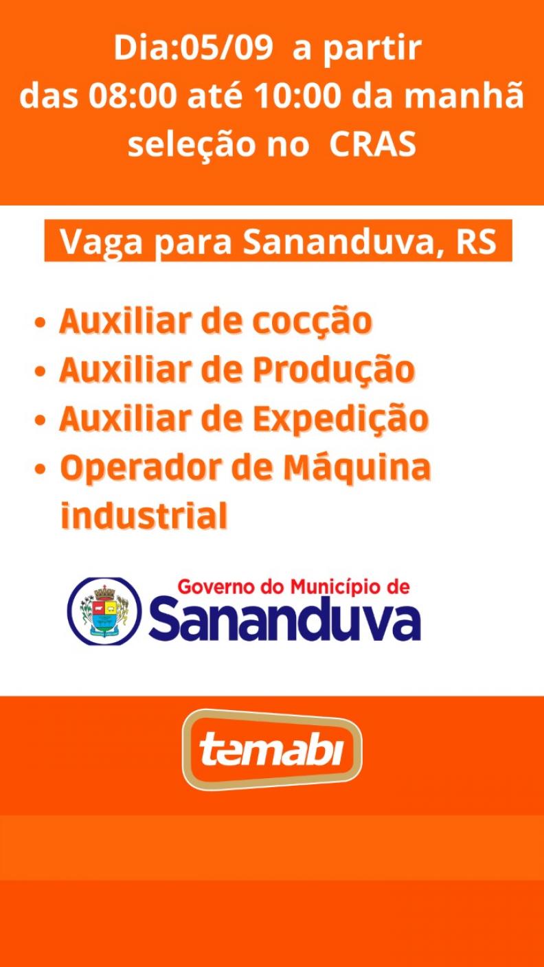 O Governo do Município de Sananduva, em parceria com a Temabi Alimentos, disponibiliza espaço para a realização do processo seletivo que visa a contratação de pessoal para trabalhar na empresa.