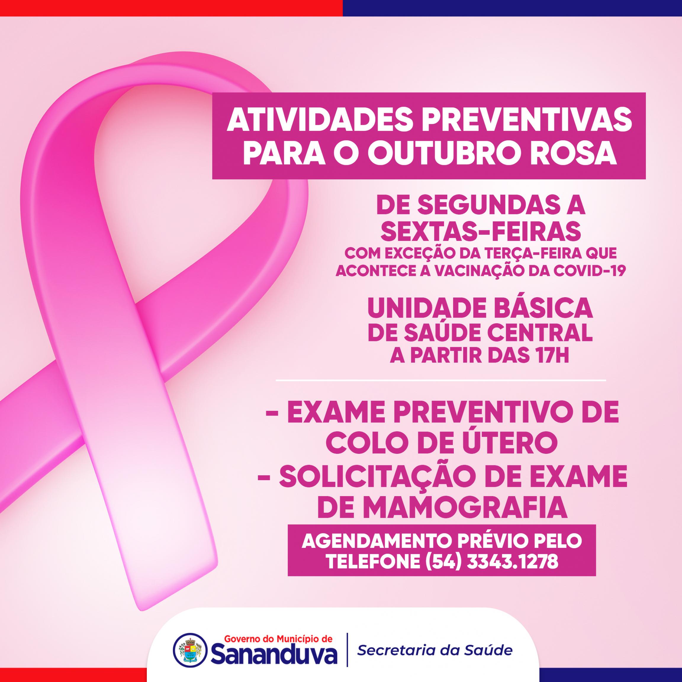 O Governo do Município de Sananduva, por meio da Secretaria da Saúde está promovendo atividades preventivas na campanha do Outubro Rosa. Confira as atividades que estão sendo realizadas na Unidade Central de Saúde e cuide-se!