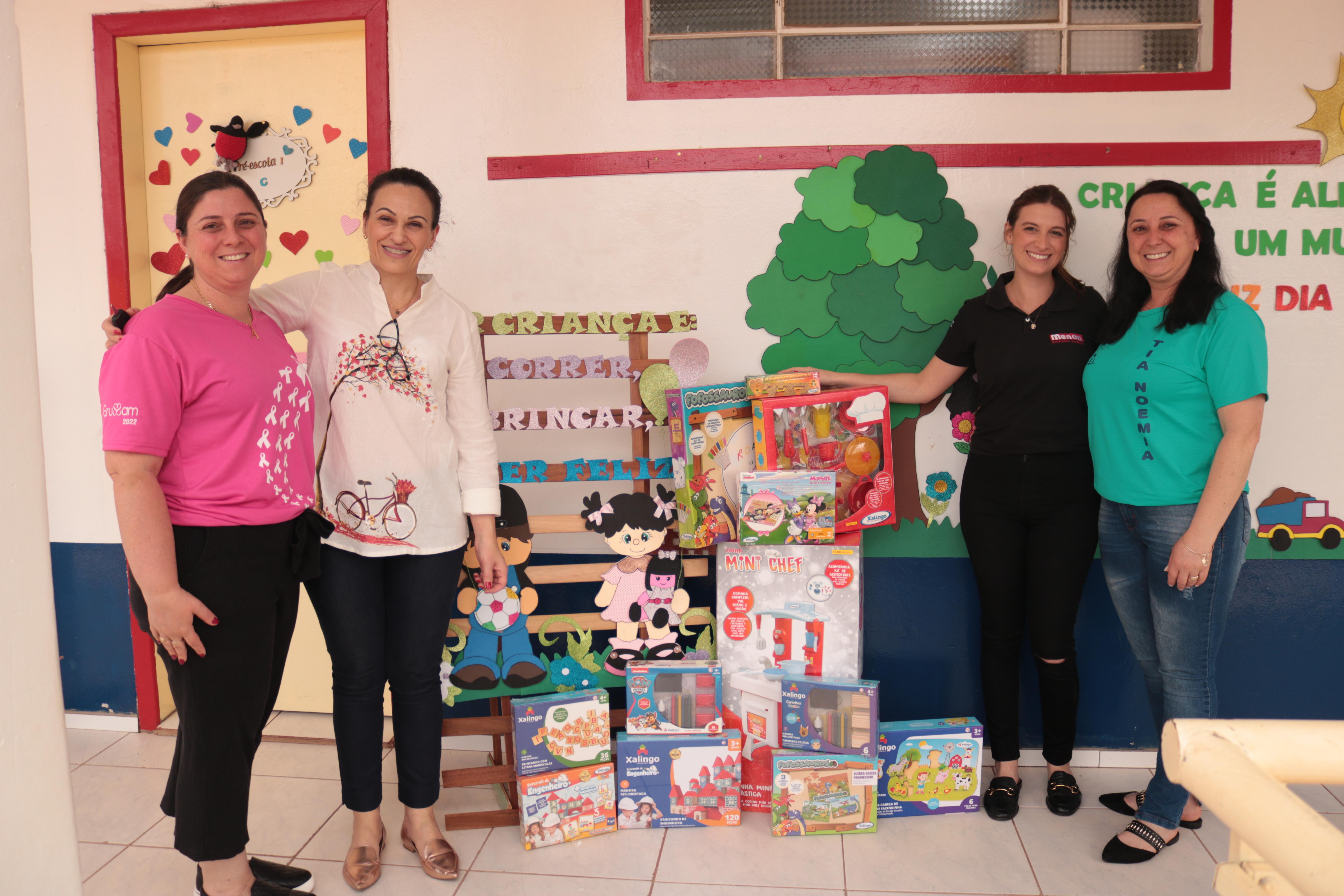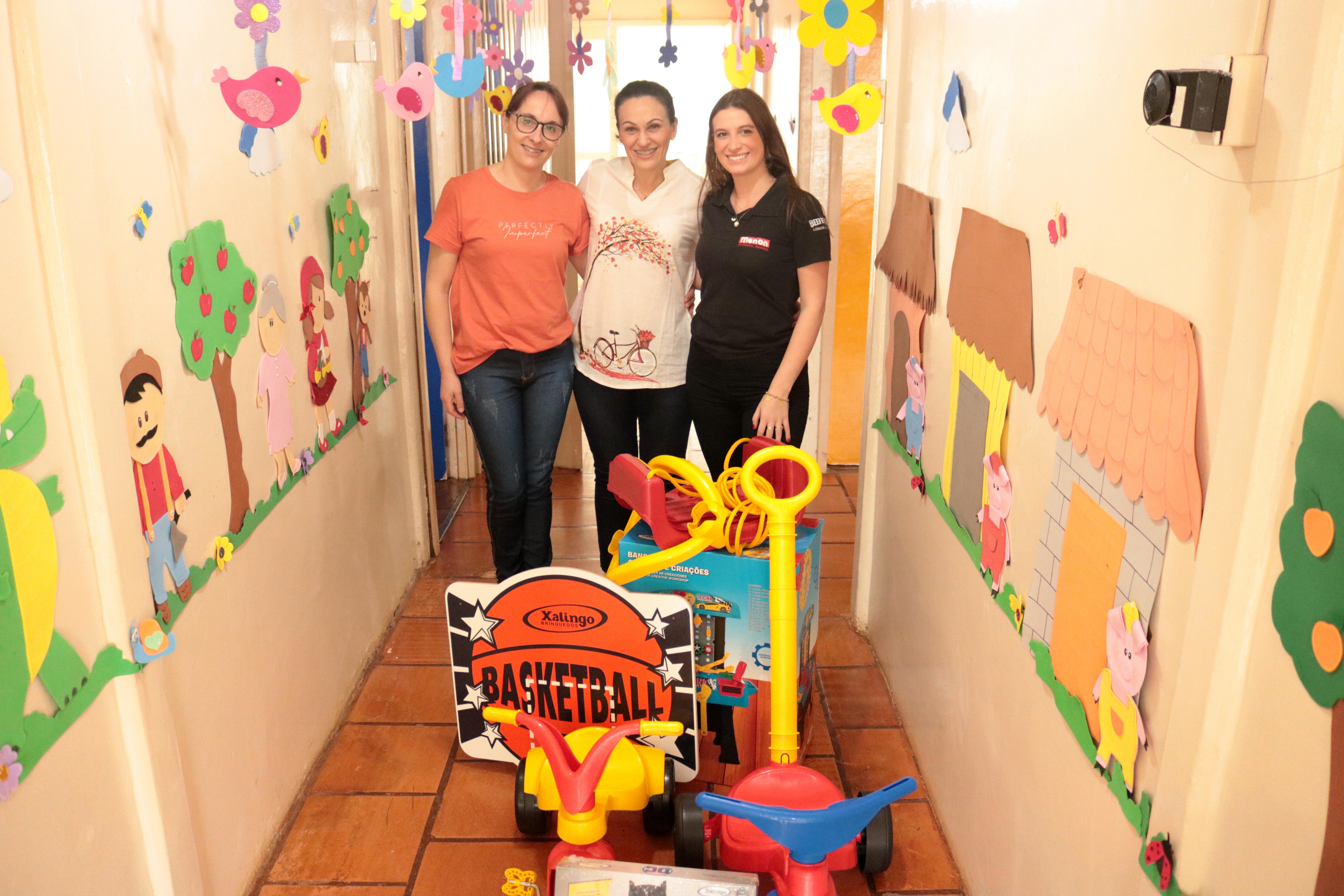 Participaram da entrega a Secretária da Educação, Luciana Crestani, e Paula Menon, representante da Menon Atacadista, empresa responsável pela doação dos brinquedos.
