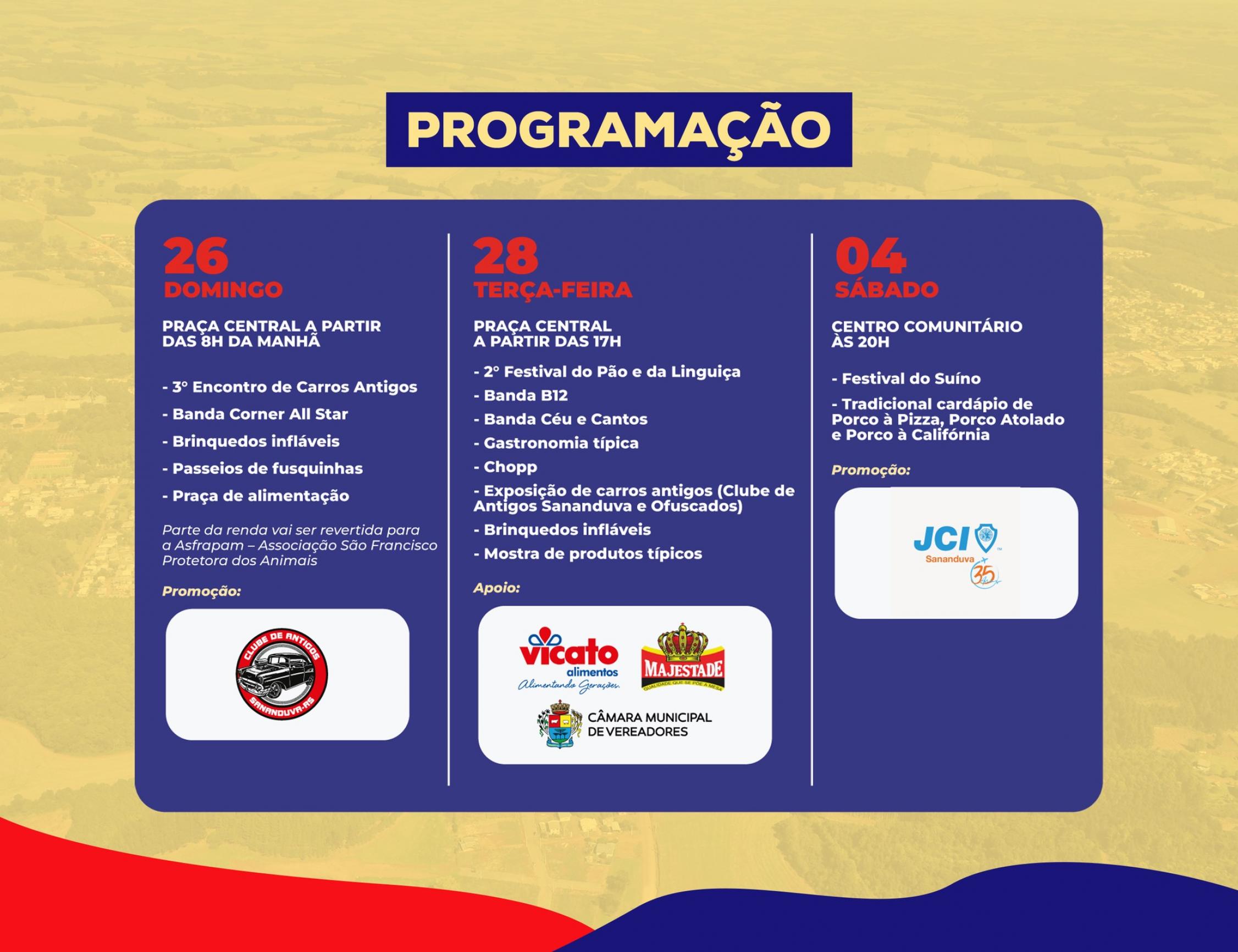 Além disso, o motivo principal da comemoração é homenagear o sananduvense, povo trabalhador, ordeiro e acolhedor. Por isso, a programação para o 68° aniversário de Sananduva promete movimentar a comunidade entre o final de fevereiro e início de março.