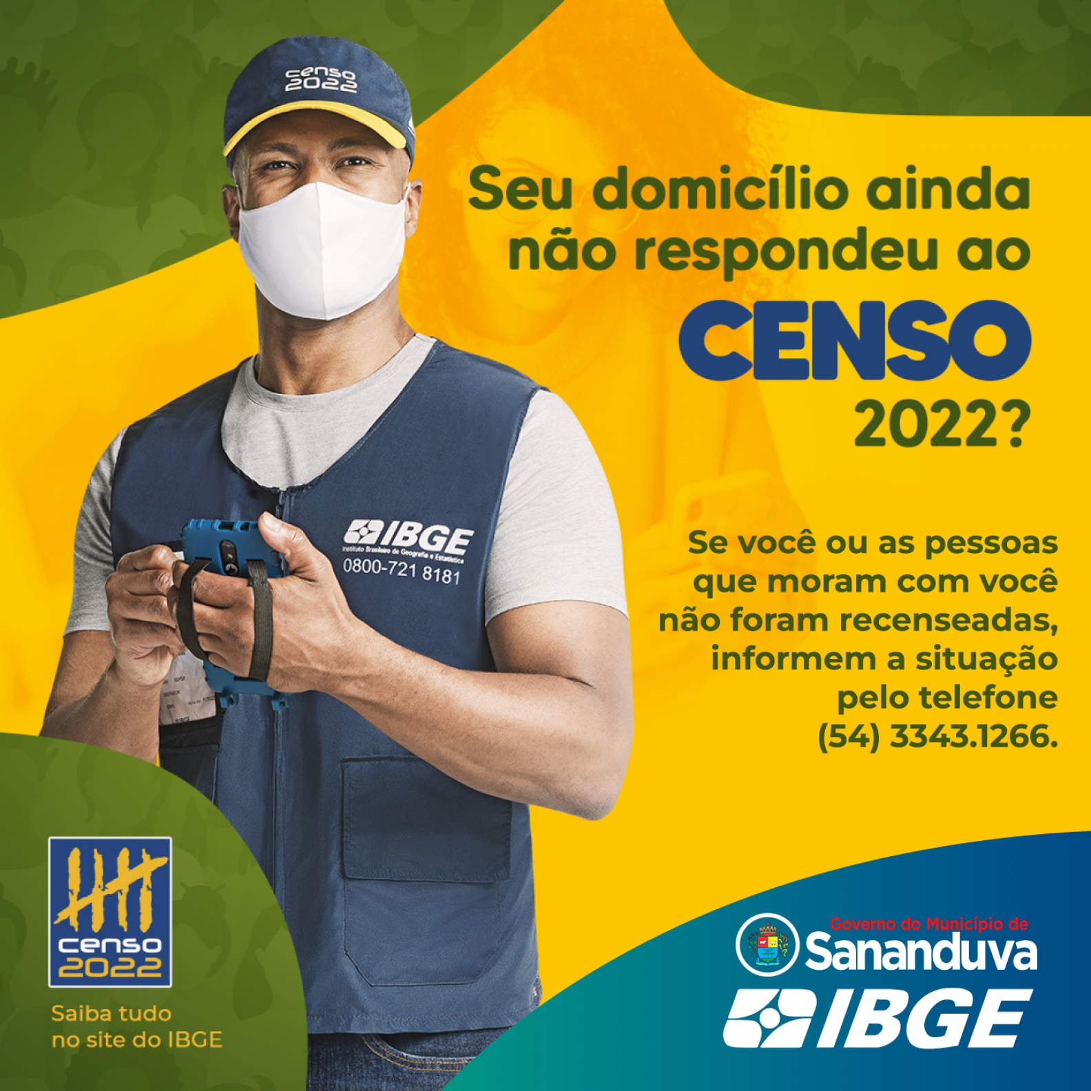 O IBGE já está na fase final do Censo Demográfico 2022. Todos esses dados são de extrema importância para a elaboração de políticas públicas. É baseado no número da população que o governo federal define o repasse para o Município. Por isso, àqueles que não responderam ao Censo ainda podem ajudar Sananduva.