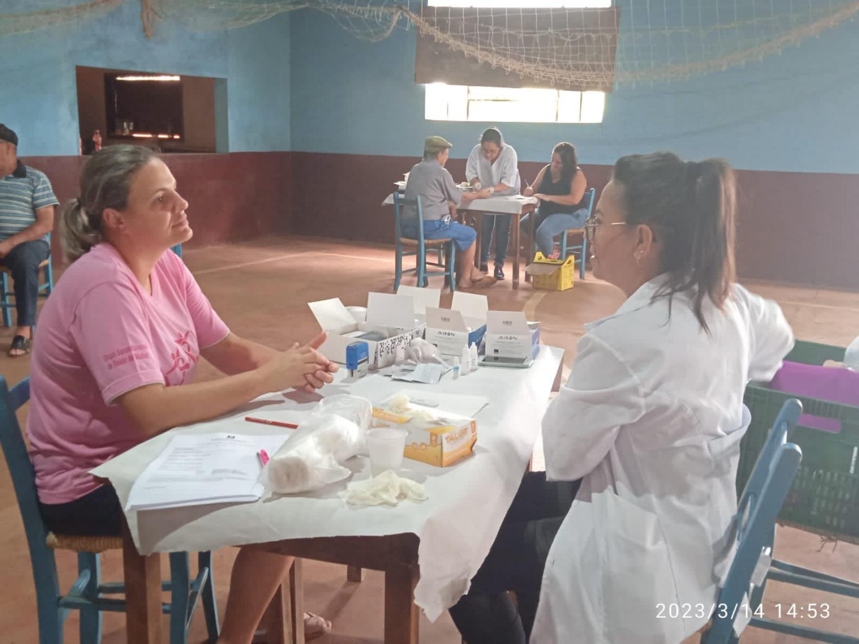 Outra ação iniciada pelas profissionais da saúde da UBS é a realização de Mini Feiras da Saúde nas comunidades do interior. As primeiras edições aconteceram nos dias 07 e 14 de março, no Assentamento Três Pinheiros e na comunidade de Santo Antônio dos Fagundes, respectivamente. “Explanamos aos idosos presentes sobre a Rede Bem Cuidar, a saúde do idoso e o envelhecer saudável. Também realizamos aferição da pressão arterial, testes rápidos de HGT, Hepatites B e C, Sífilis e HIV”, comenta a enfermeira Rosemar Portella Wilhelm.