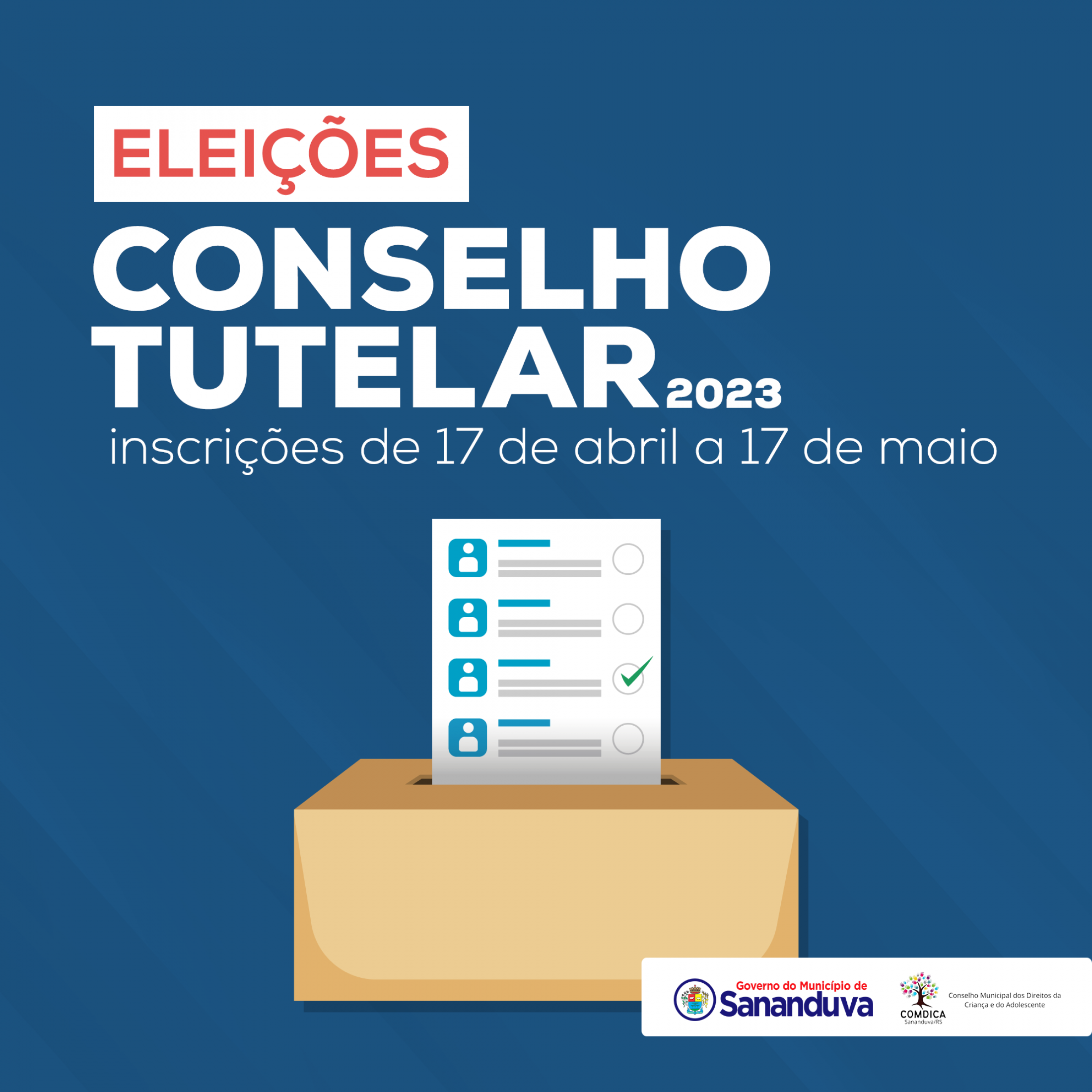 O Conselho Municipal dos Direitos da Criança e do Adolescente de Sananduva publicou edital de convocação para o processo de escolha dos conselheiros tutelares titulares e suplentes do município de Sananduva.