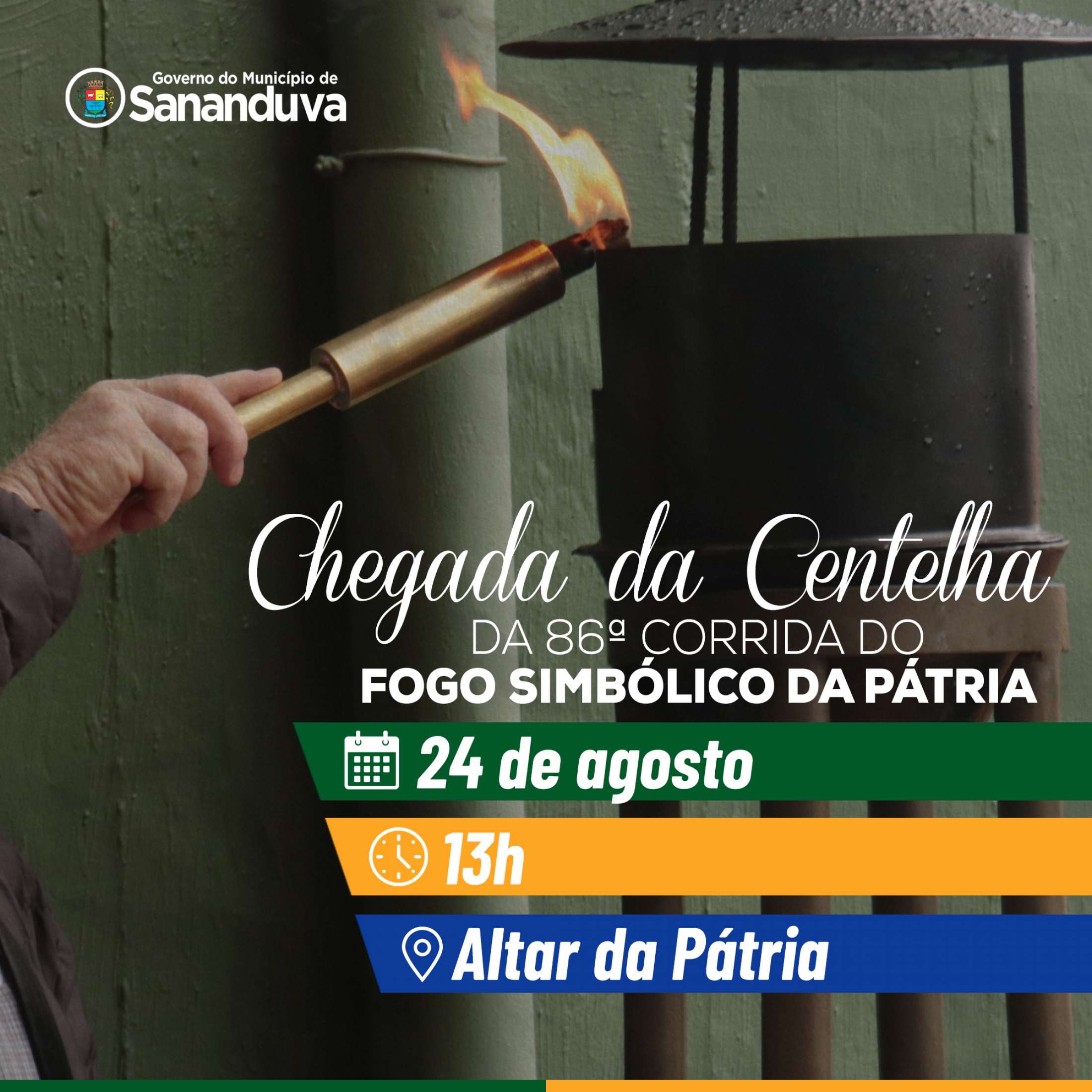 Na quinta-feira, dia 24 de agosto, o Município vai receber a Centelha da 86ª Corrida do Fogo Simbólico da Pátria, a partir das 13h, no Altar da Pátria.