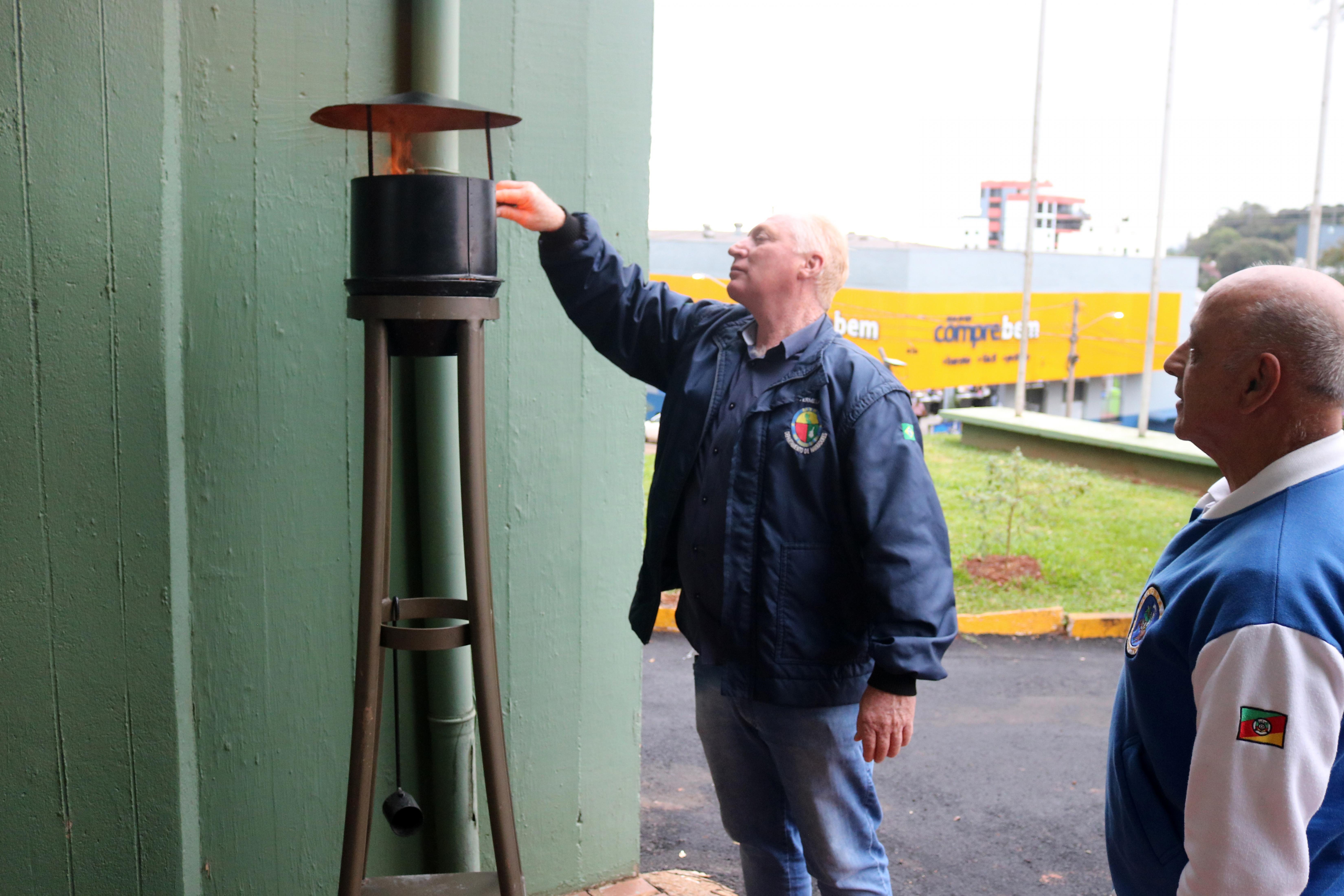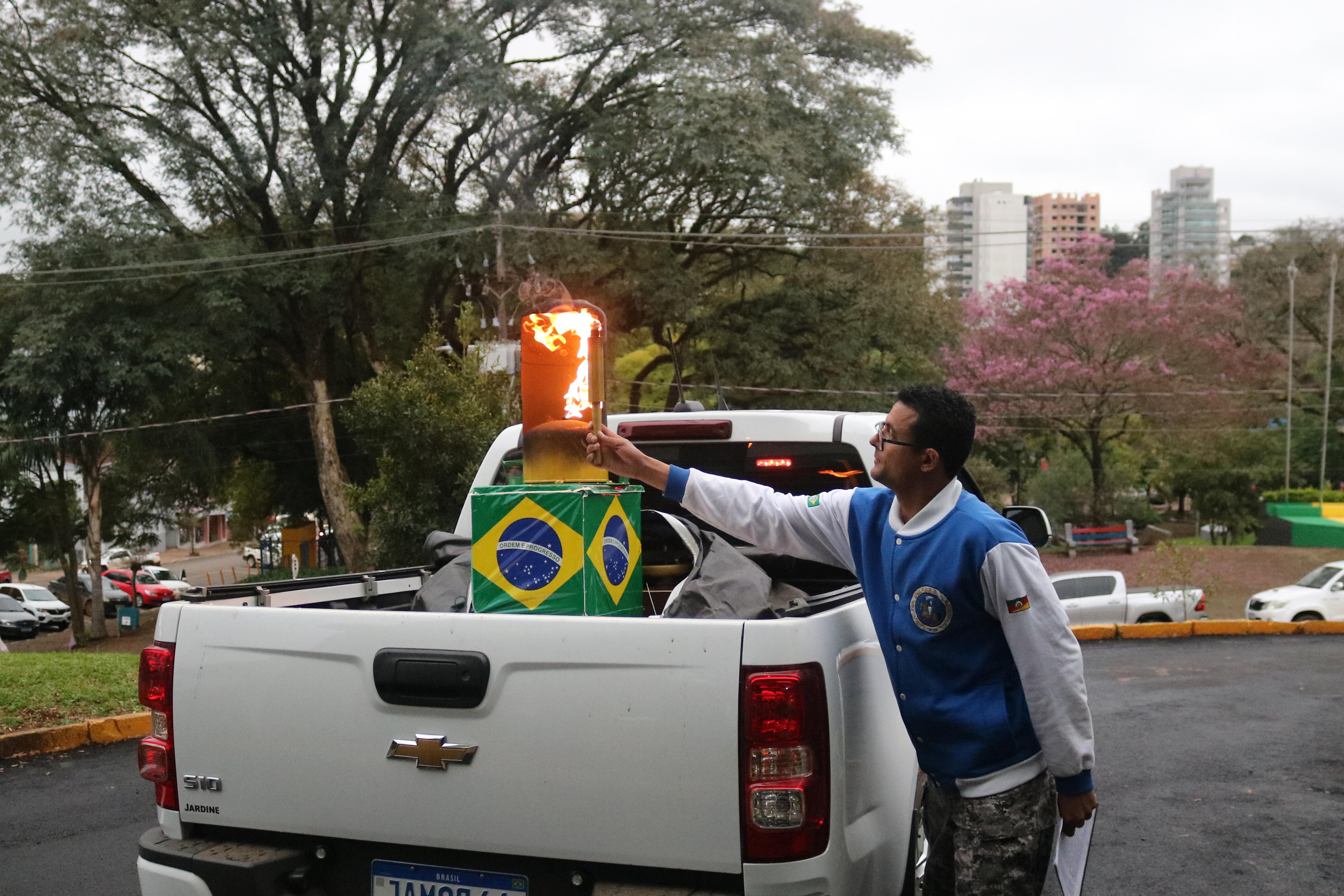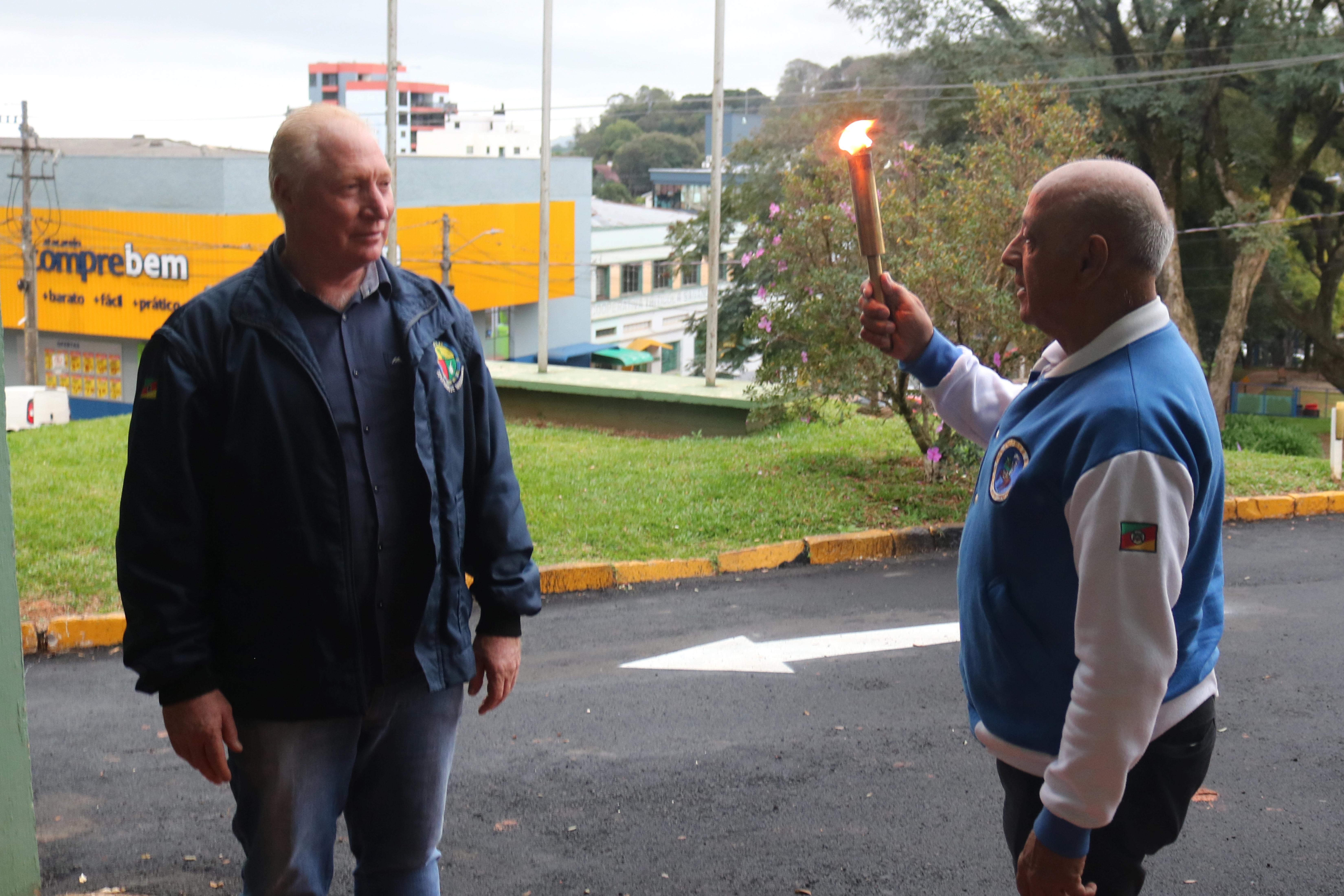 O prefeito Vermelho Pansera recebeu das mãos do Coronel Ataíde Moraes Rodrigues, presidente da Liga da Defesa Nacional do Rio Grande do Sul, o Fogo Simbólico e procedeu com o acendimento da Pira. “Sabemos do simbolismo desta chama e destacamos a importância dela para demonstrar o pertencimento de todos na sociedade. Agradeço a Liga da Defesa Nacional por mais uma vez estar presente no nosso Município”, destacou o prefeito.