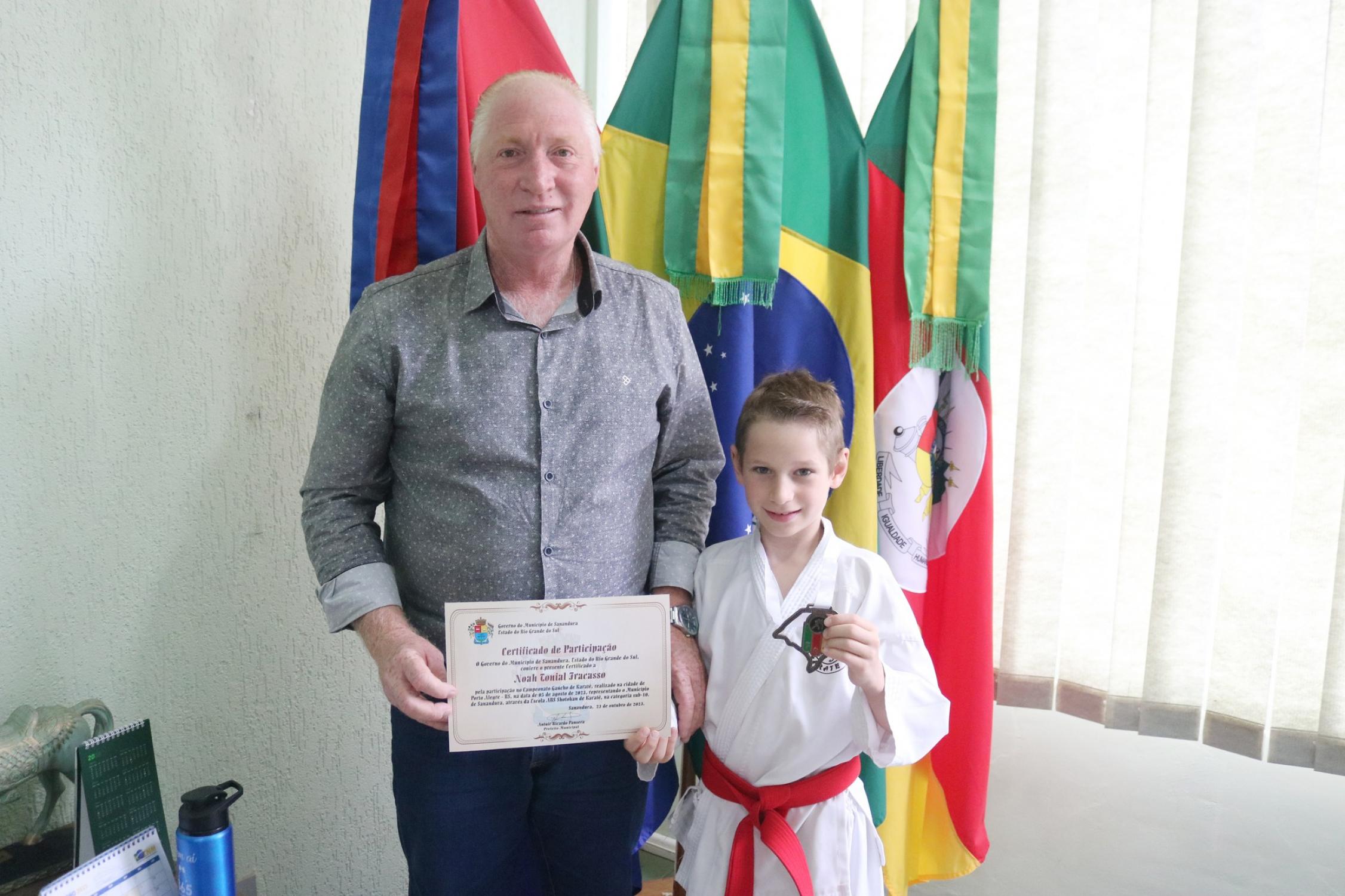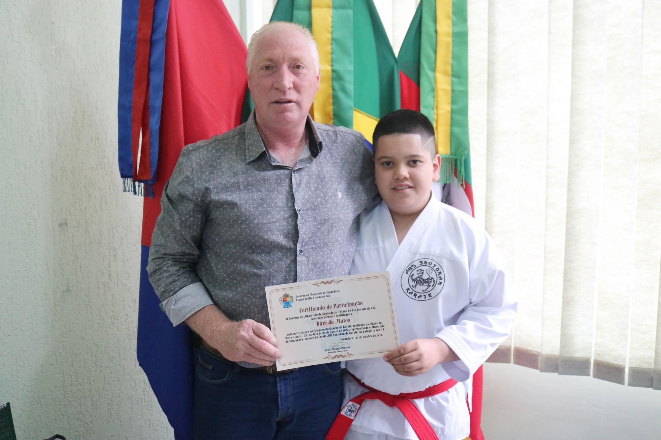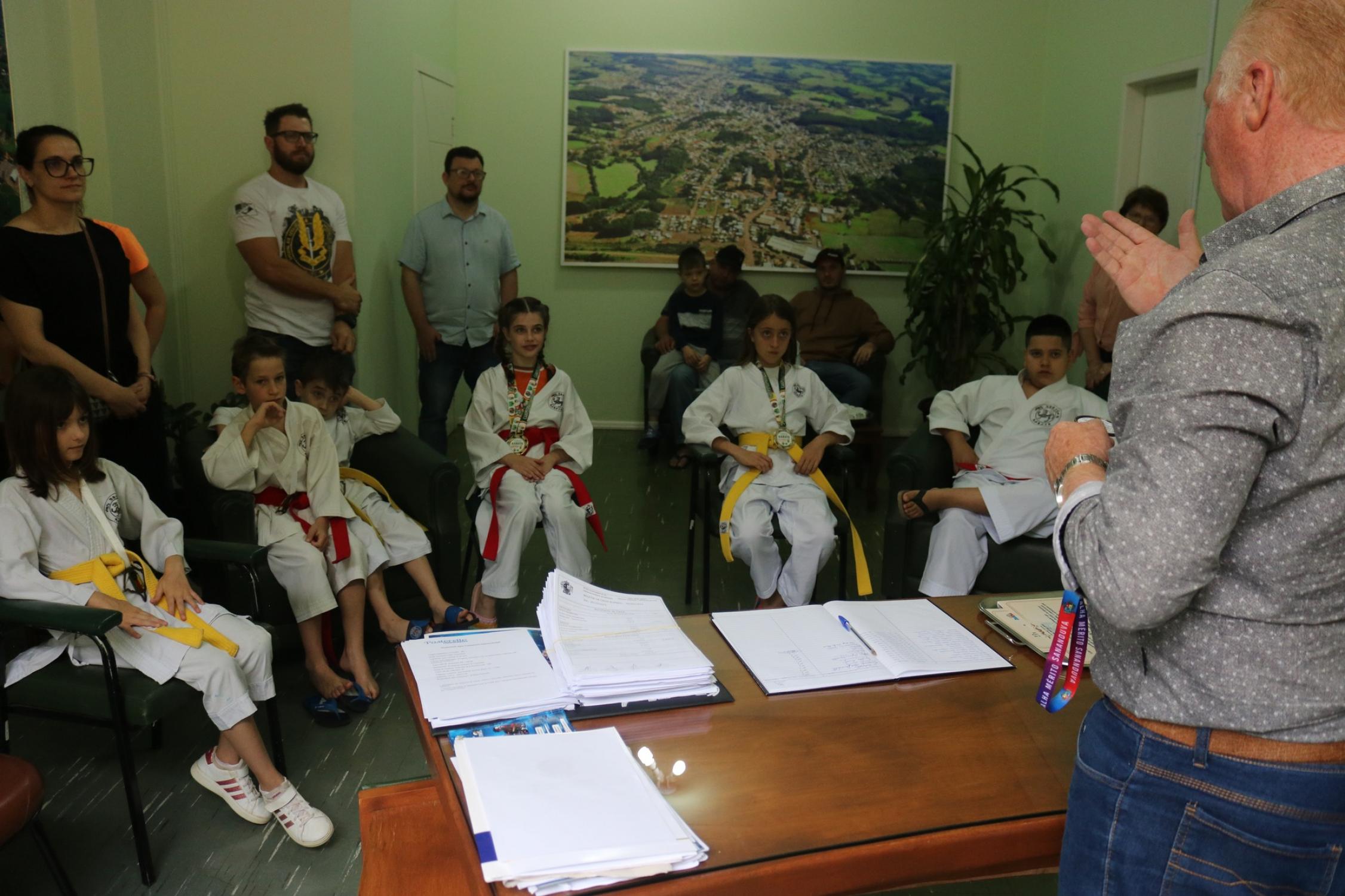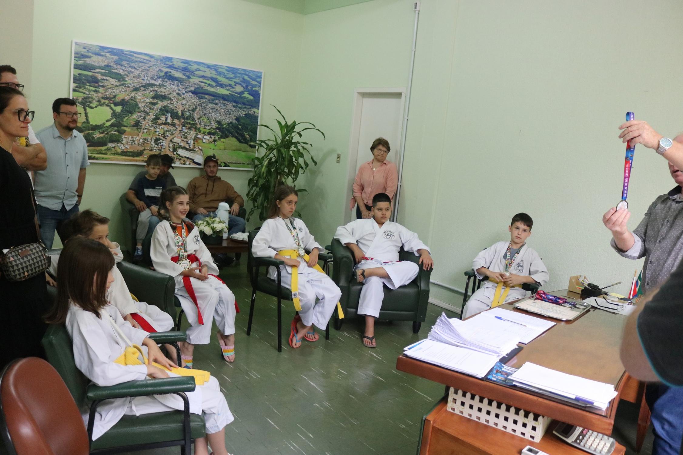 Na presença dos pais, competidores, professor e de autoridades municipais, o prefeito Vermelho Pansera realizou a entrega da Medalha Mérito Sananduva e dos certificados de participação aos representantes sananduvenses que estiveram competindo no Campeonato Gaúcho de Karatê, realizado no dia 05 de agosto, na cidade de Porto Alegre.