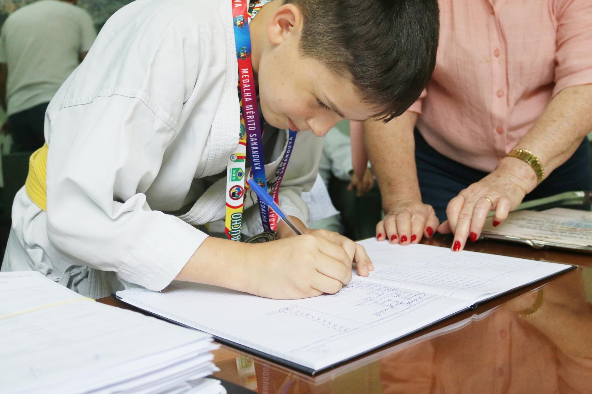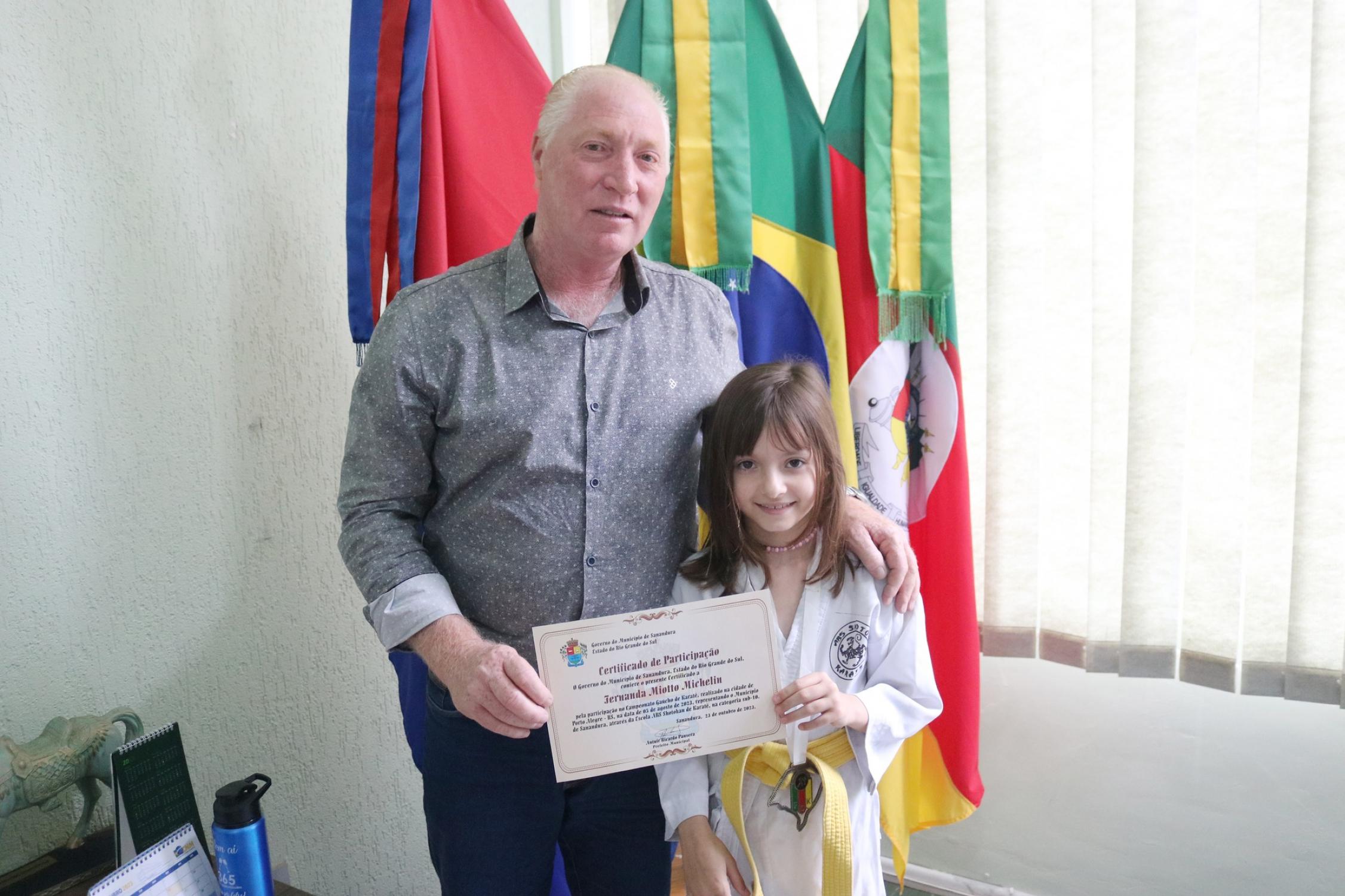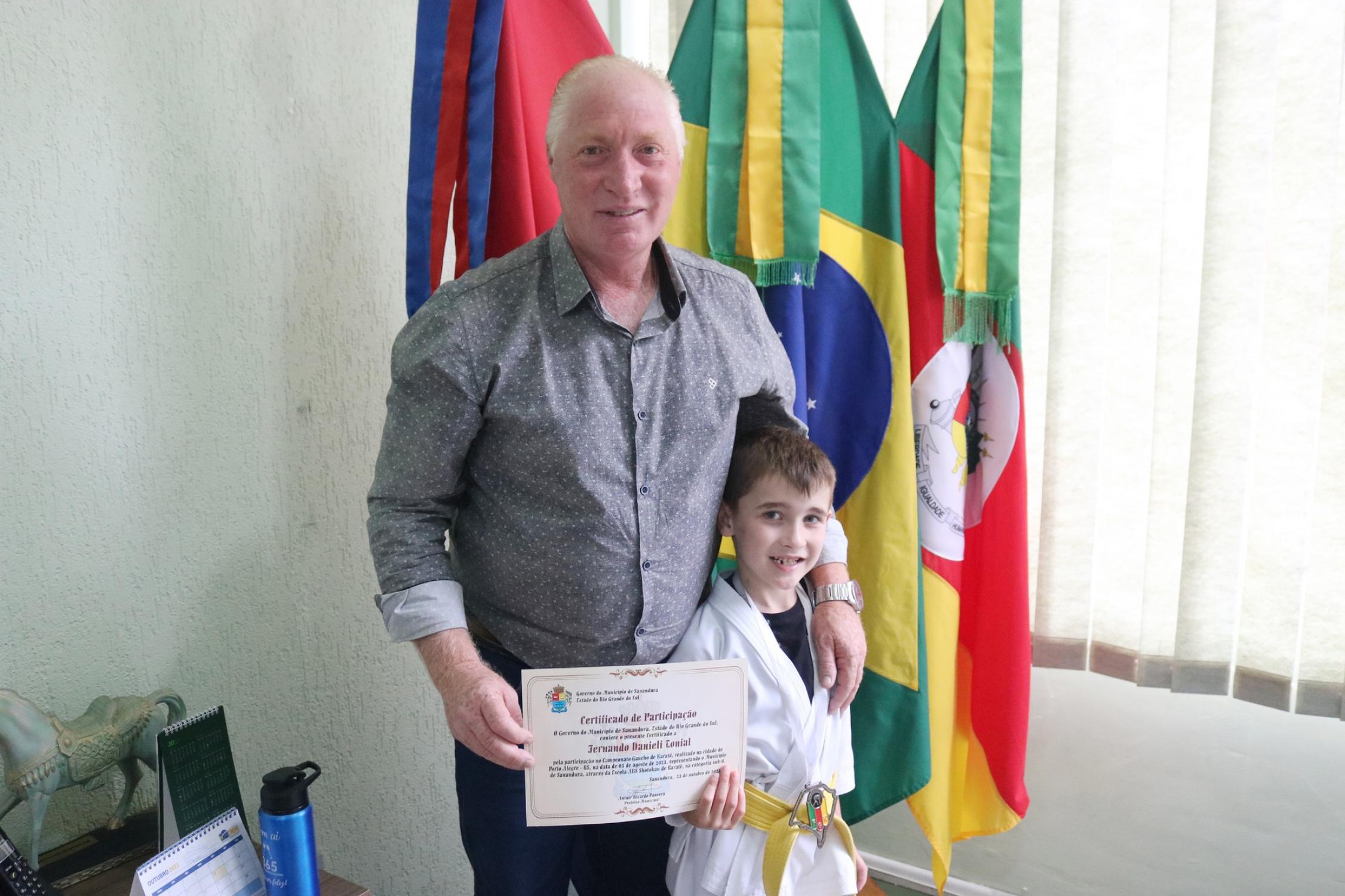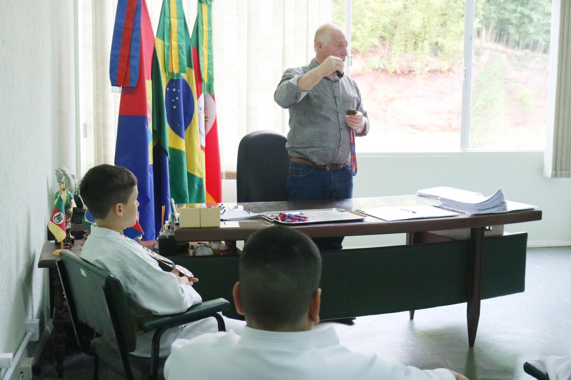 Na presença dos pais, competidores, professor e de autoridades municipais, o prefeito Vermelho Pansera realizou a entrega da Medalha Mérito Sananduva e dos certificados de participação aos representantes sananduvenses que estiveram competindo no Campeonato Gaúcho de Karatê, realizado no dia 05 de agosto, na cidade de Porto Alegre.
