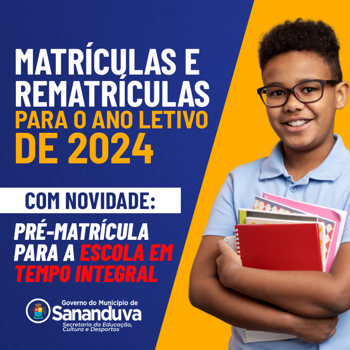 Nesta segunda-feira, dia 13, inicia o período de matrículas e rematrículas para o ano letivo de 2024, em todas as escolas da rede municipal de ensino de Sananduva. Para o próximo ano letivo, a novidade é a oferta de duas turmas em tempo integral no 1º ano do ensino fundamental, na Escola Municipal de Ensino Fundamental Santa Teresinha.